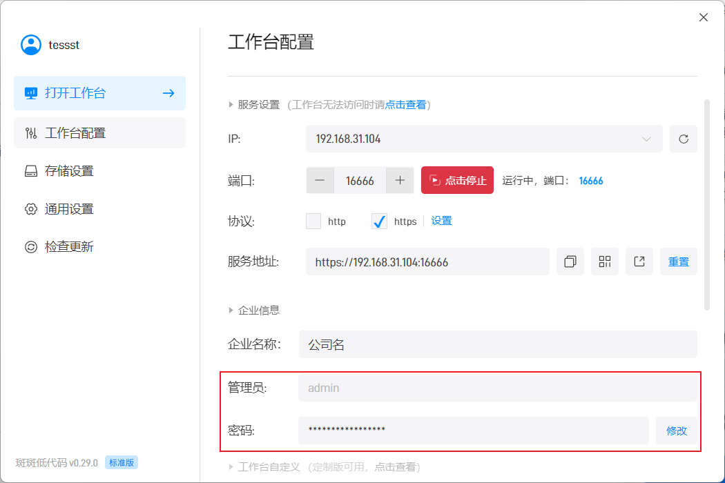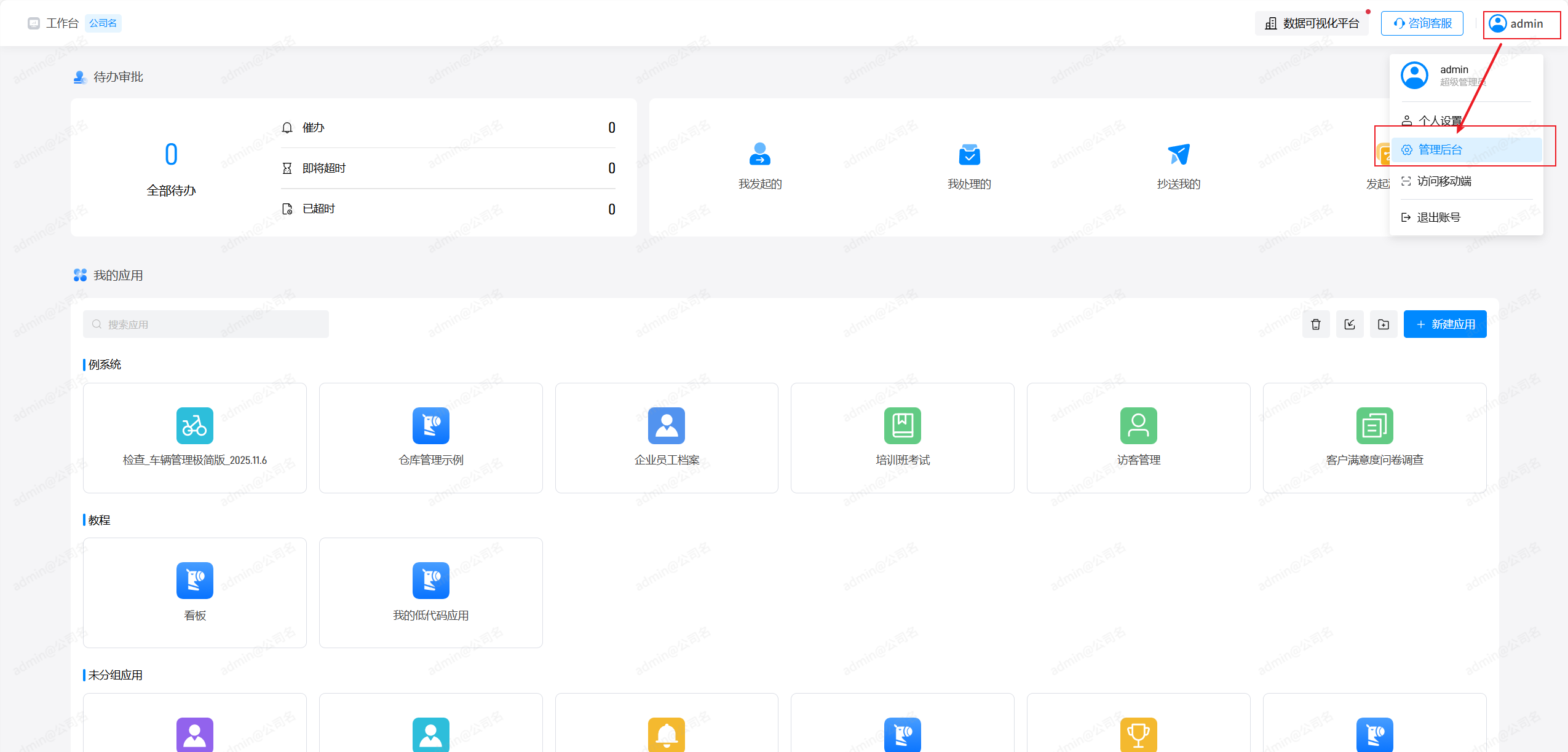 管理员由超级管理员设置,首先进入工作台,点击管理后台,如下图: