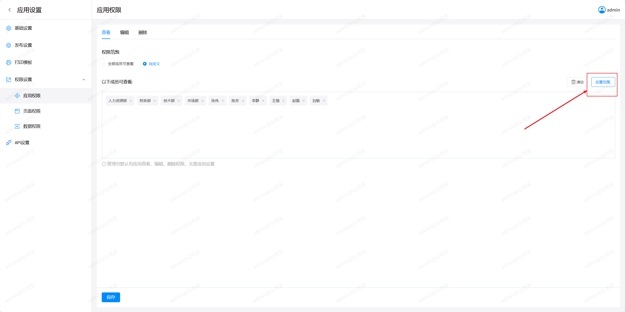 应用设置界面点击应用权限,然后选择查看,在查看界面点击自定义按钮,
