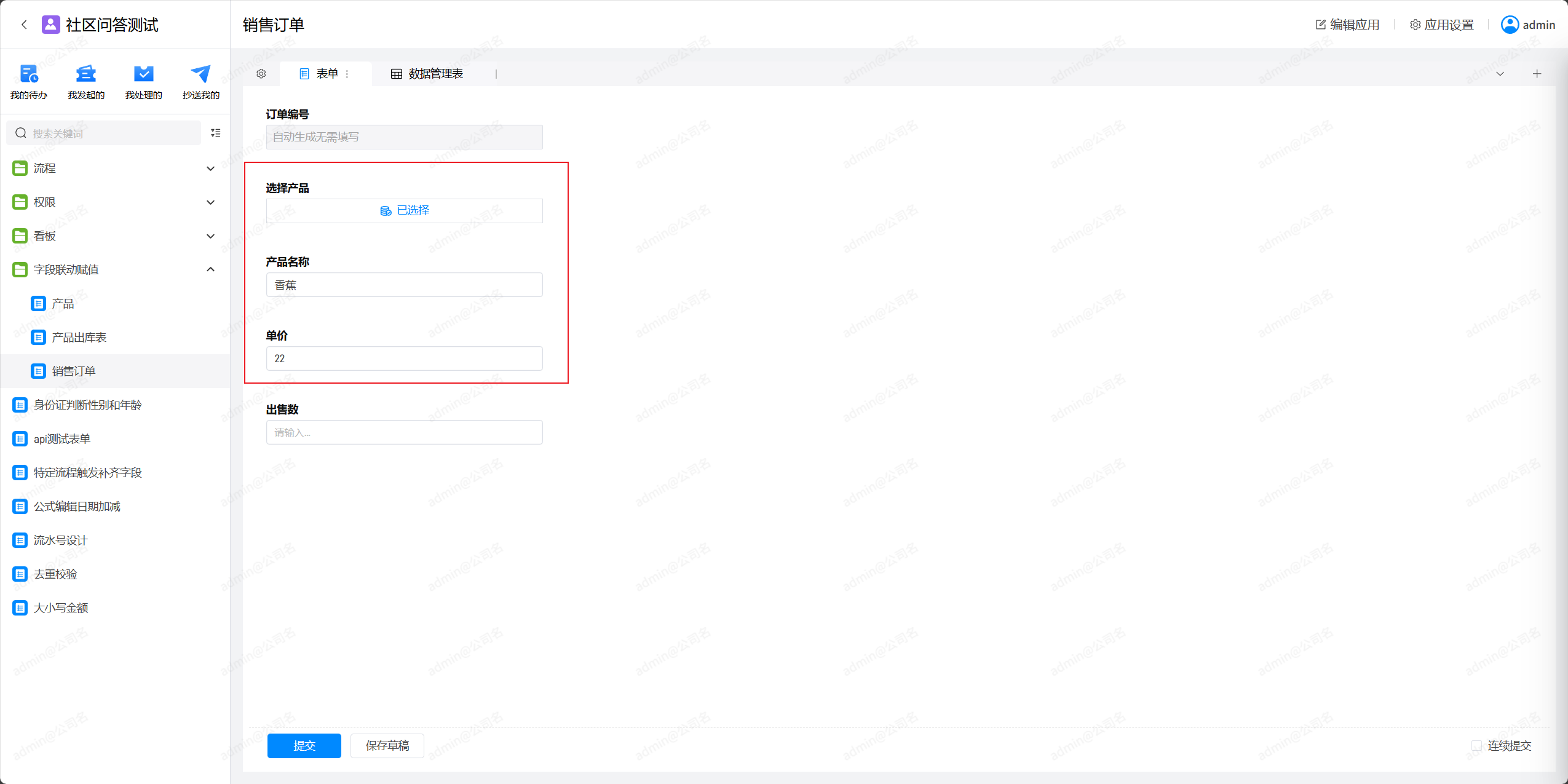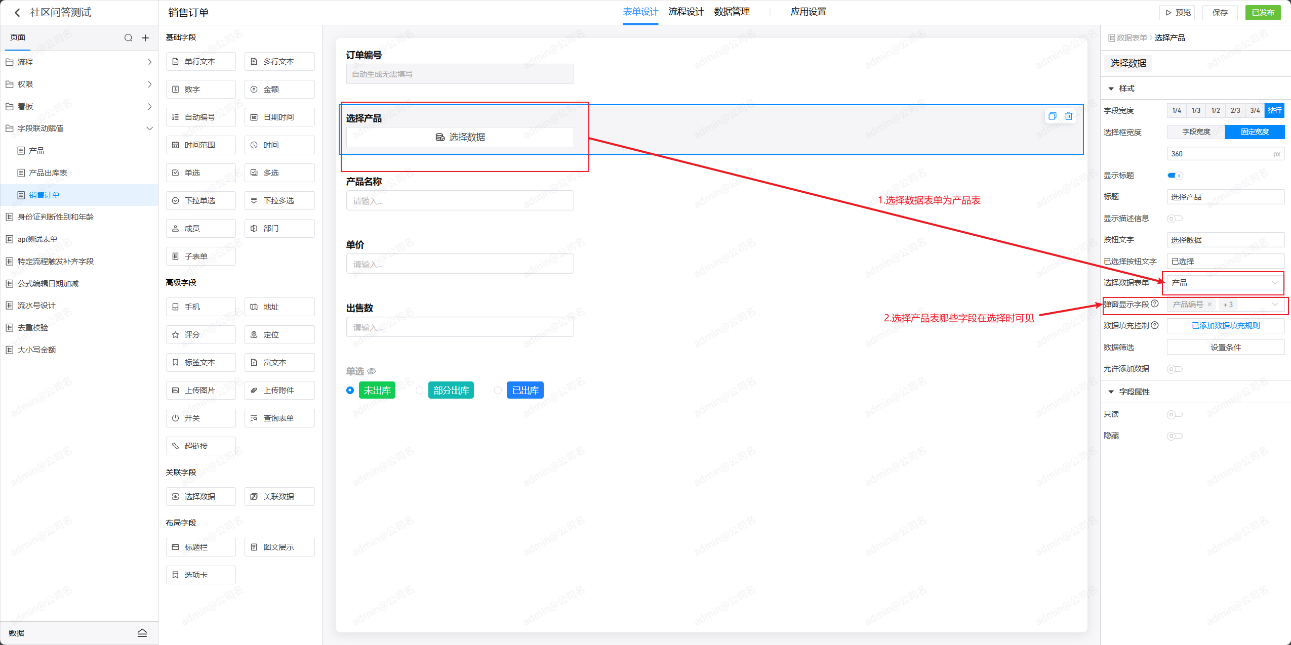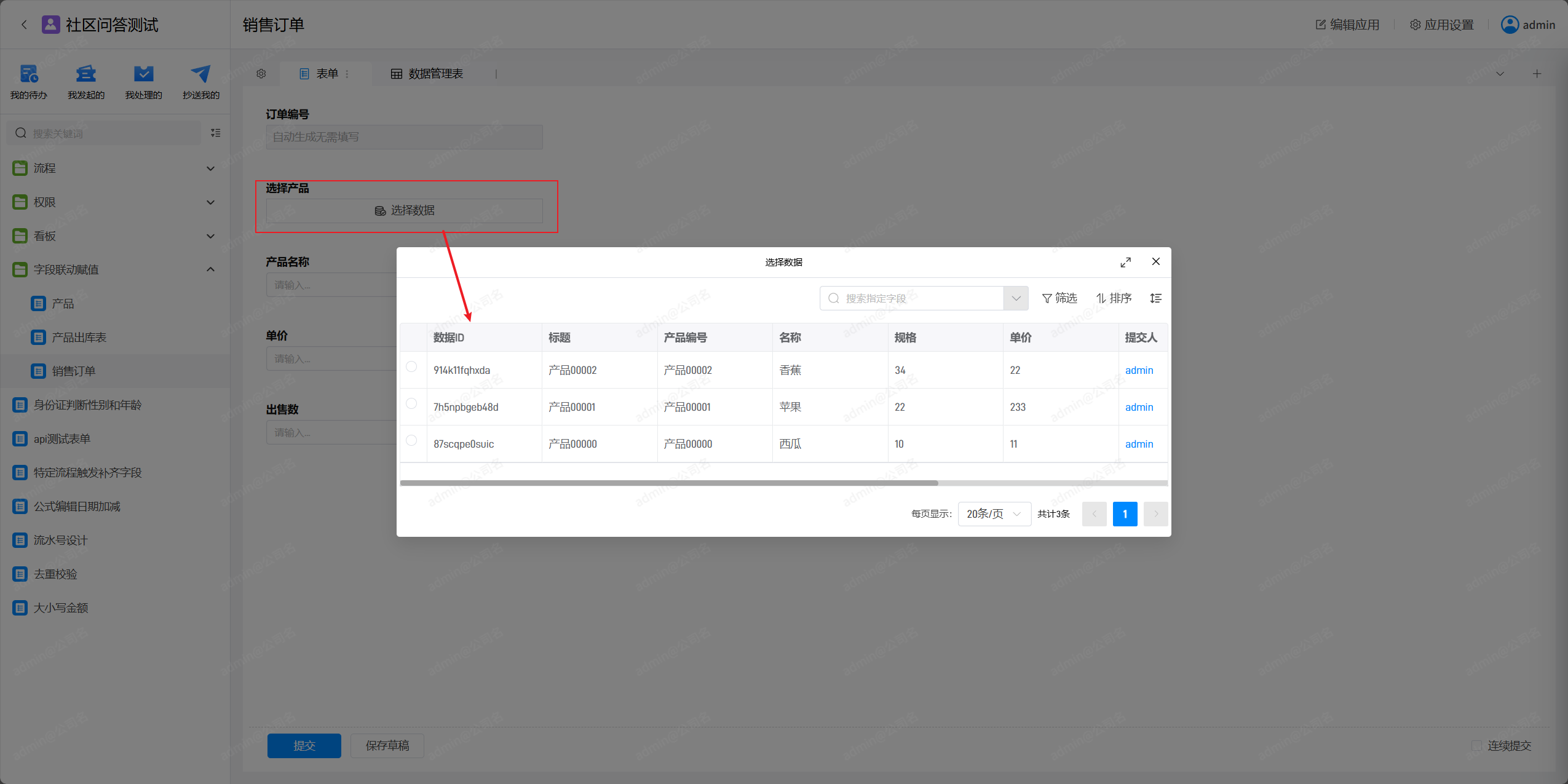 回到销售订单表提交表单界面,点击选择数据按钮,选择要填充的数据: