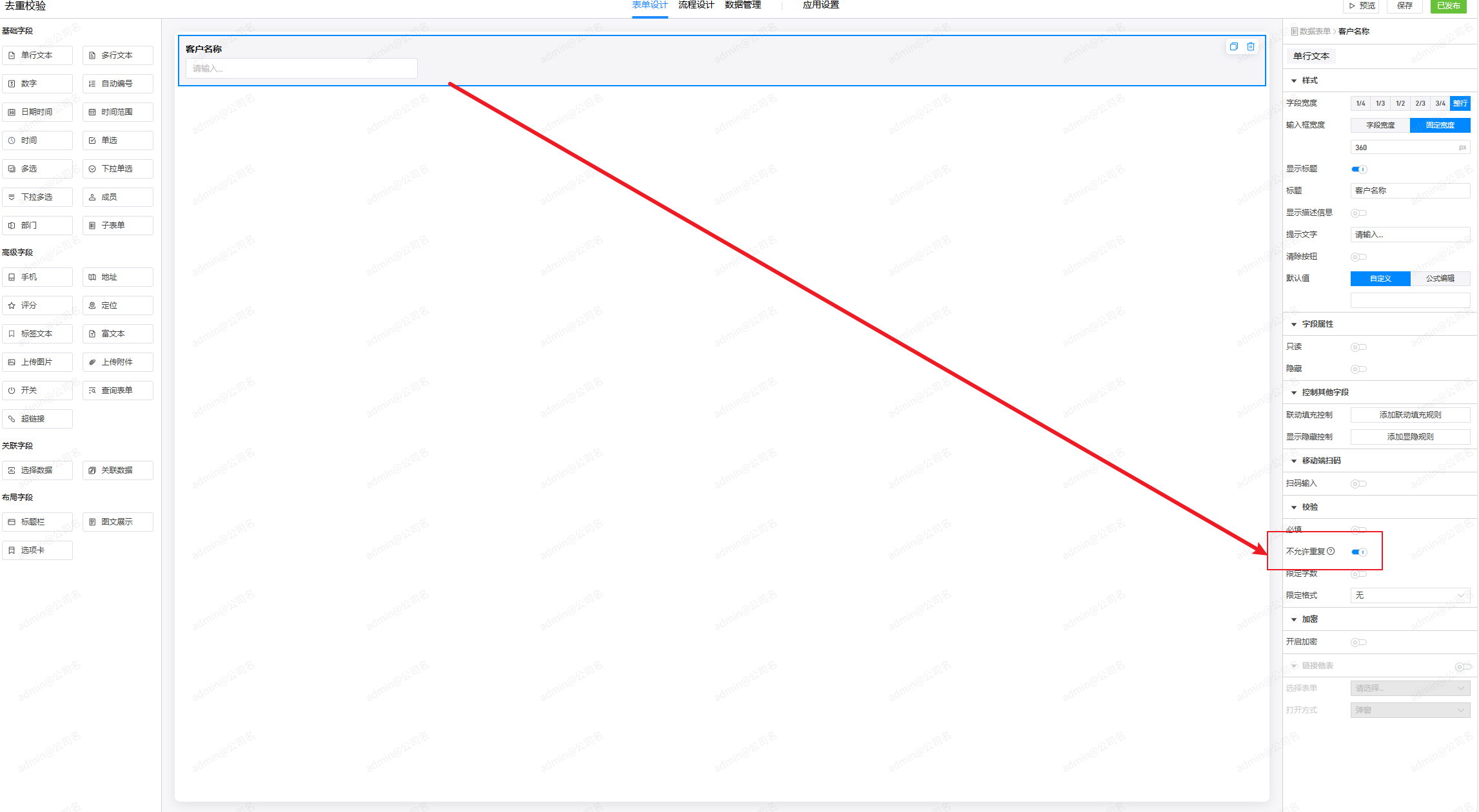 在应用界面点击编辑应用,在表单设计界面找到对应要检验的字段,在字段的属性栏里勾选“不允许重复”即可。
