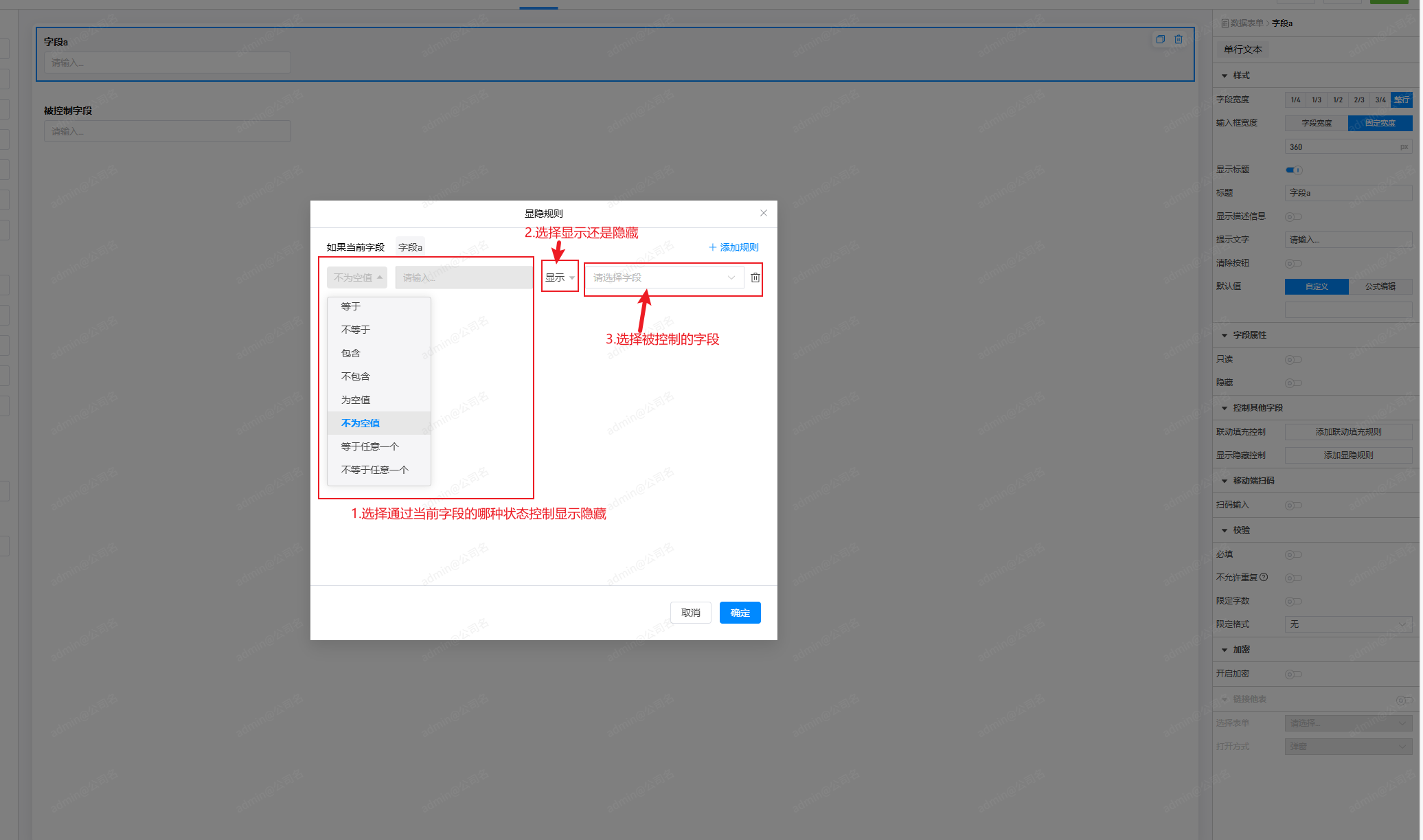 字段的显示和隐藏通过字段属性栏的控制其他字段的设置显隐规则实现。