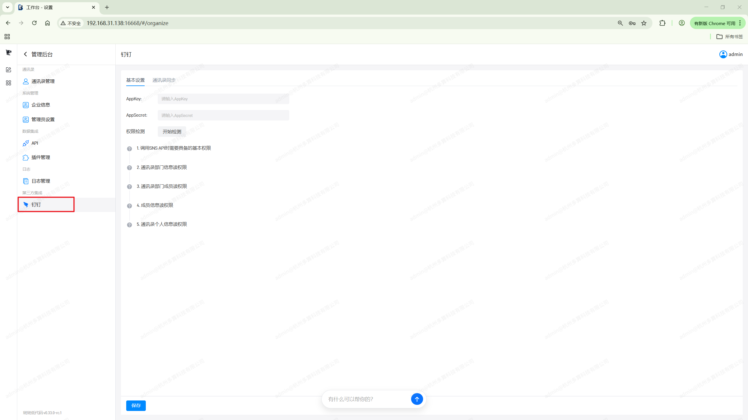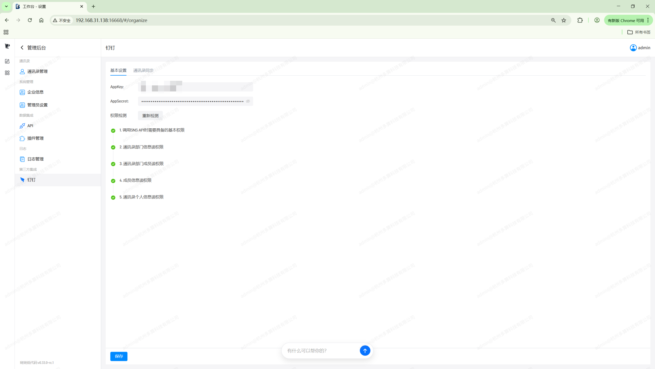 在管理后台切换到钉钉,在基本设置中填入上面的AppKey和AppSecret,然后点击开始检测。