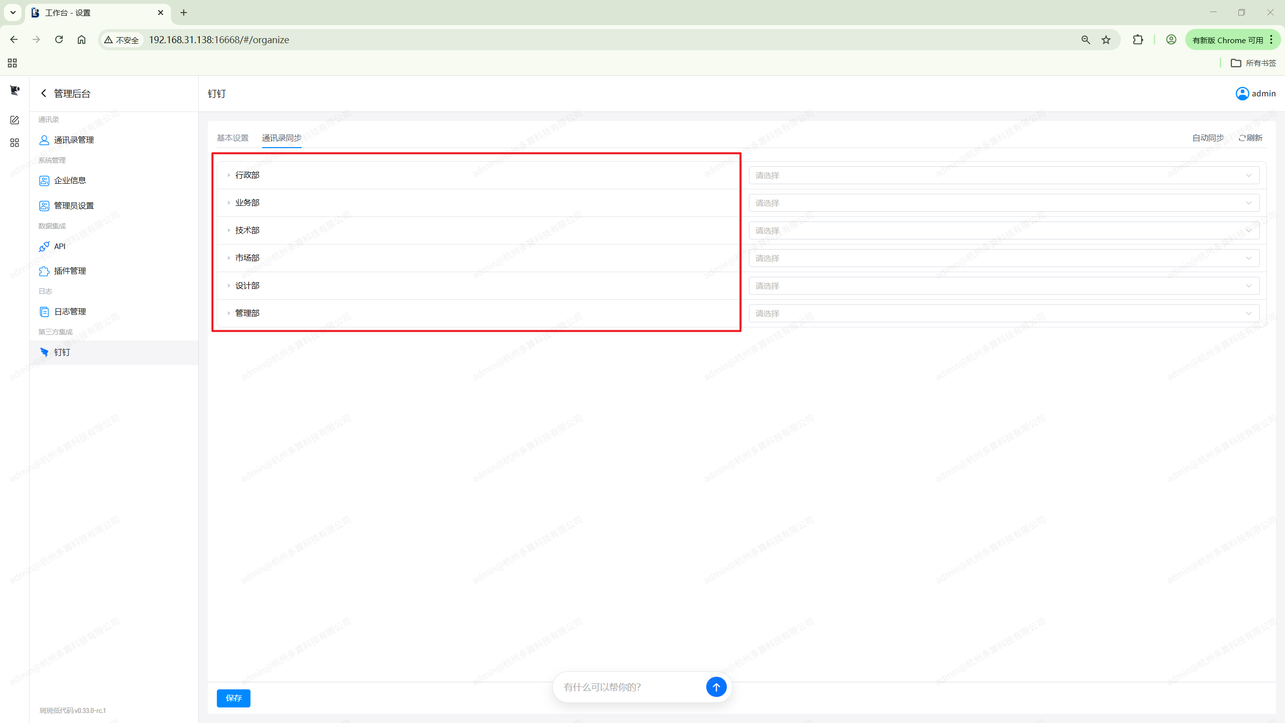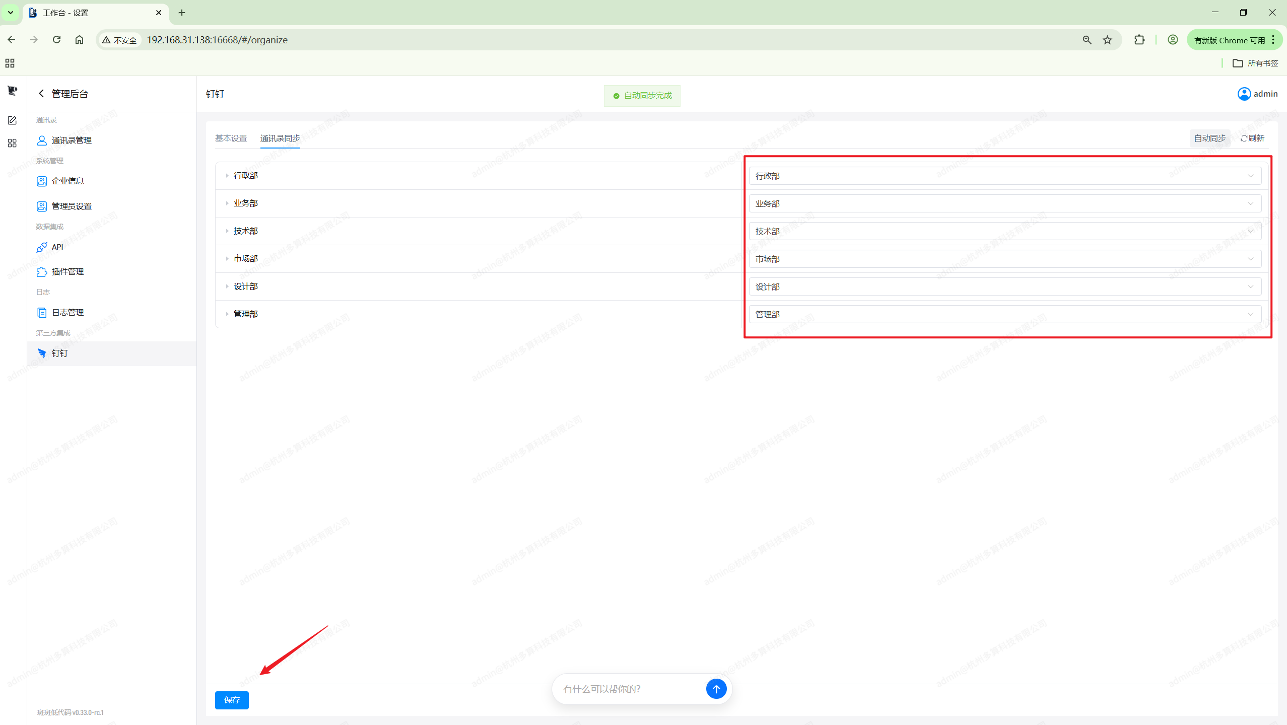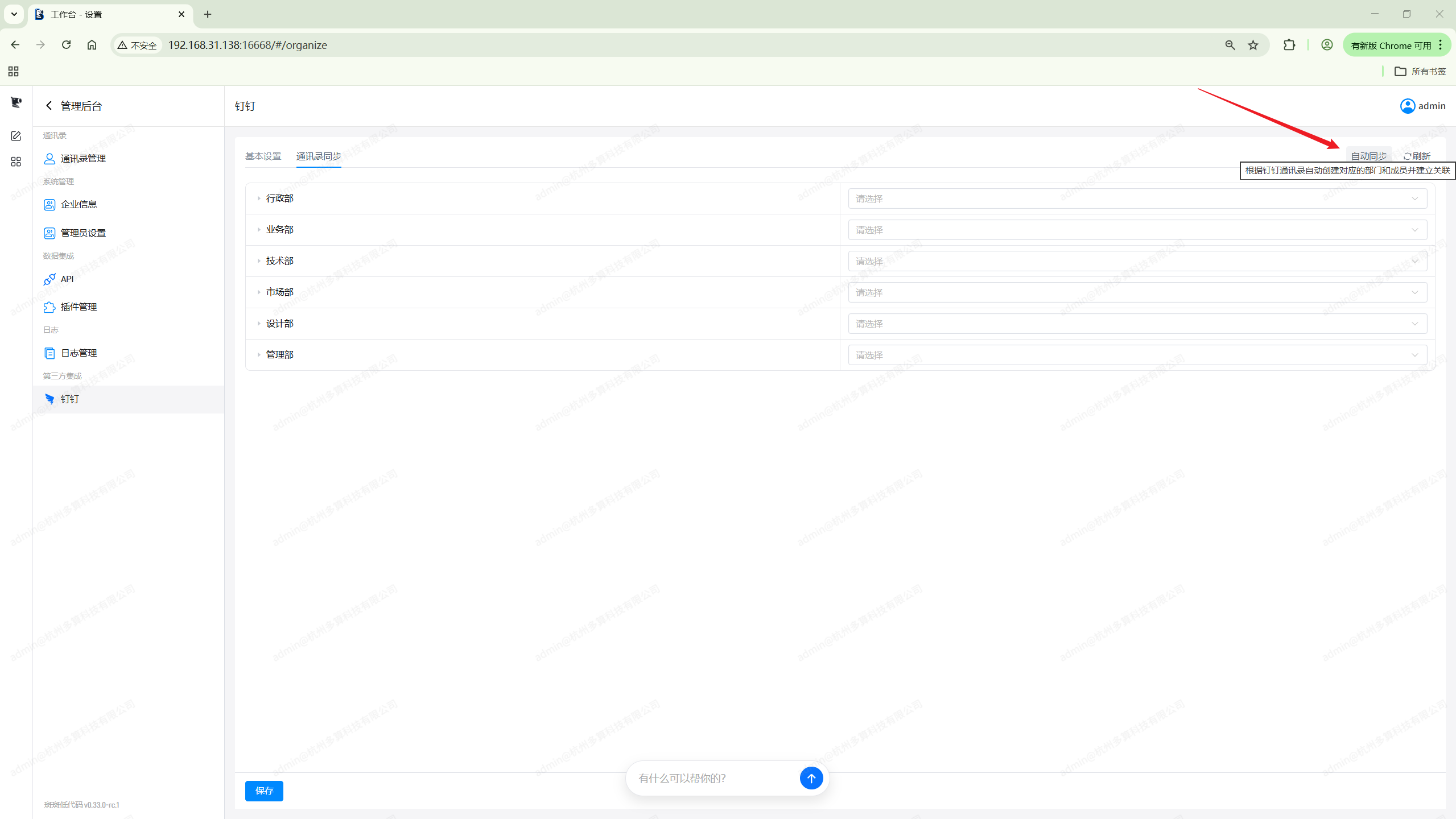 如果我们希望本地账号和钉钉完全一致,可以直接点击右上角的自动同步按钮。系统会 根据钉钉通讯录自动创建对应的部门和成员并建立关联。
