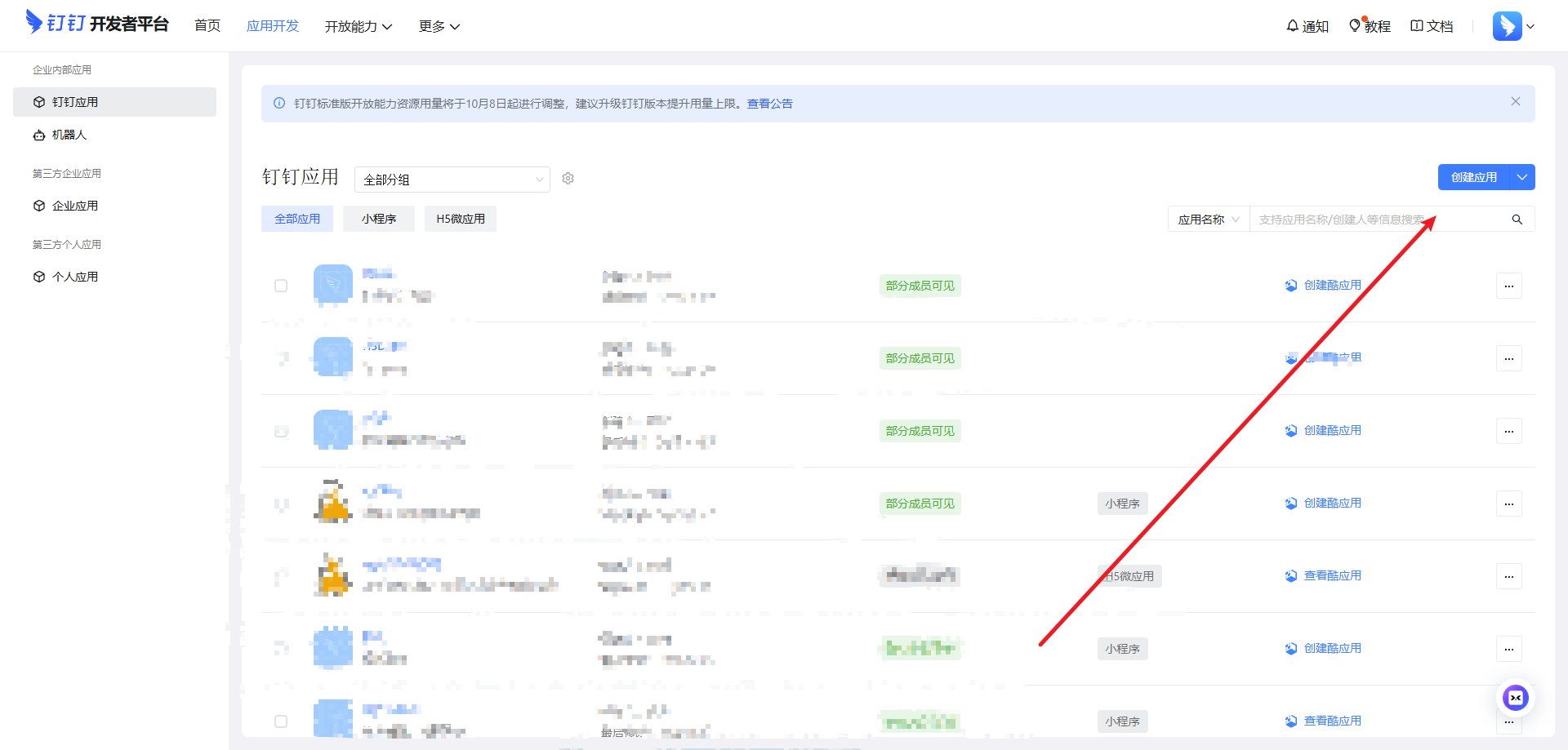 访问 https://open-dev.dingtalk.com/,登录之后进入到开发者后台,然后切换到应用开发界面,点击创建应用。
