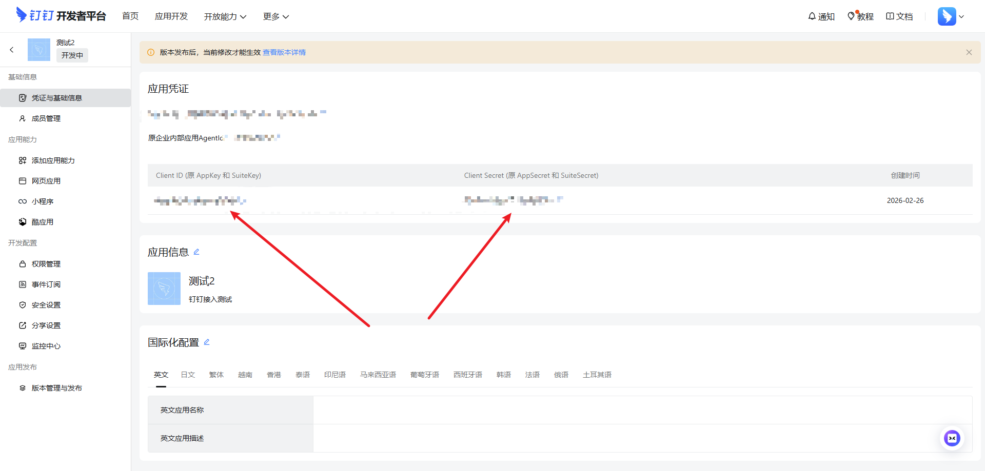 创建完成之后,进入到应用里面,左侧菜单点击凭证与基础信息(旧版钉钉应用是在 应用信息里面),里面可以看到AppKey和AppSecret,这两项需要添加到斑斑里面。