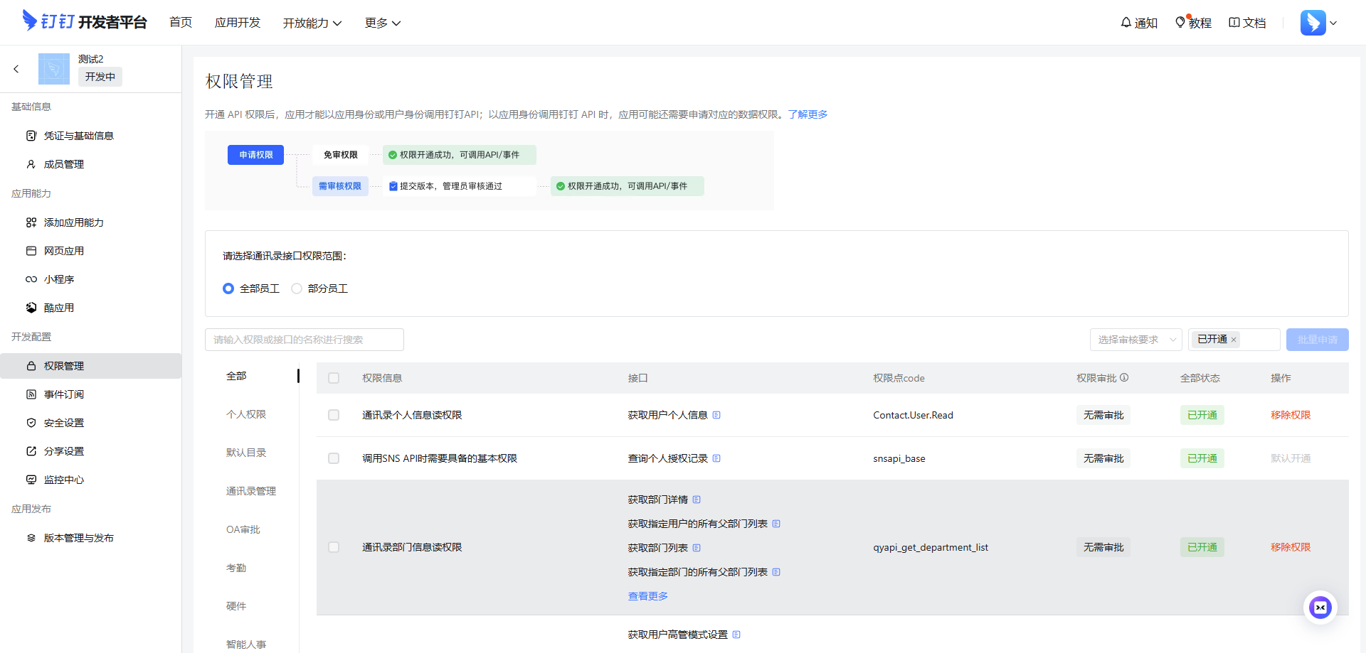 在左侧菜单中找到权限管理,然后在右侧开通,对接需要开通以下权限(可以直接搜索权限):