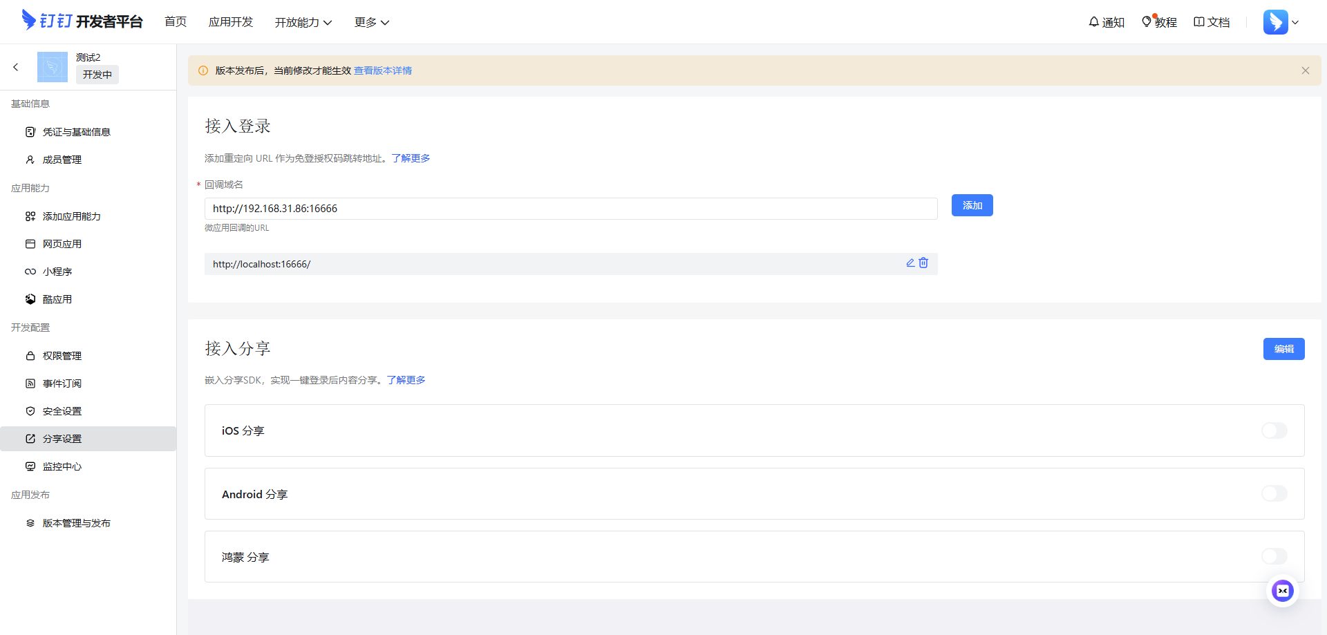 在左侧菜单中点击分享设置(旧版钉钉应用是在 登录与分享里面),然后在接入登录中的回调域名中填入斑斑的工作台服务地址。