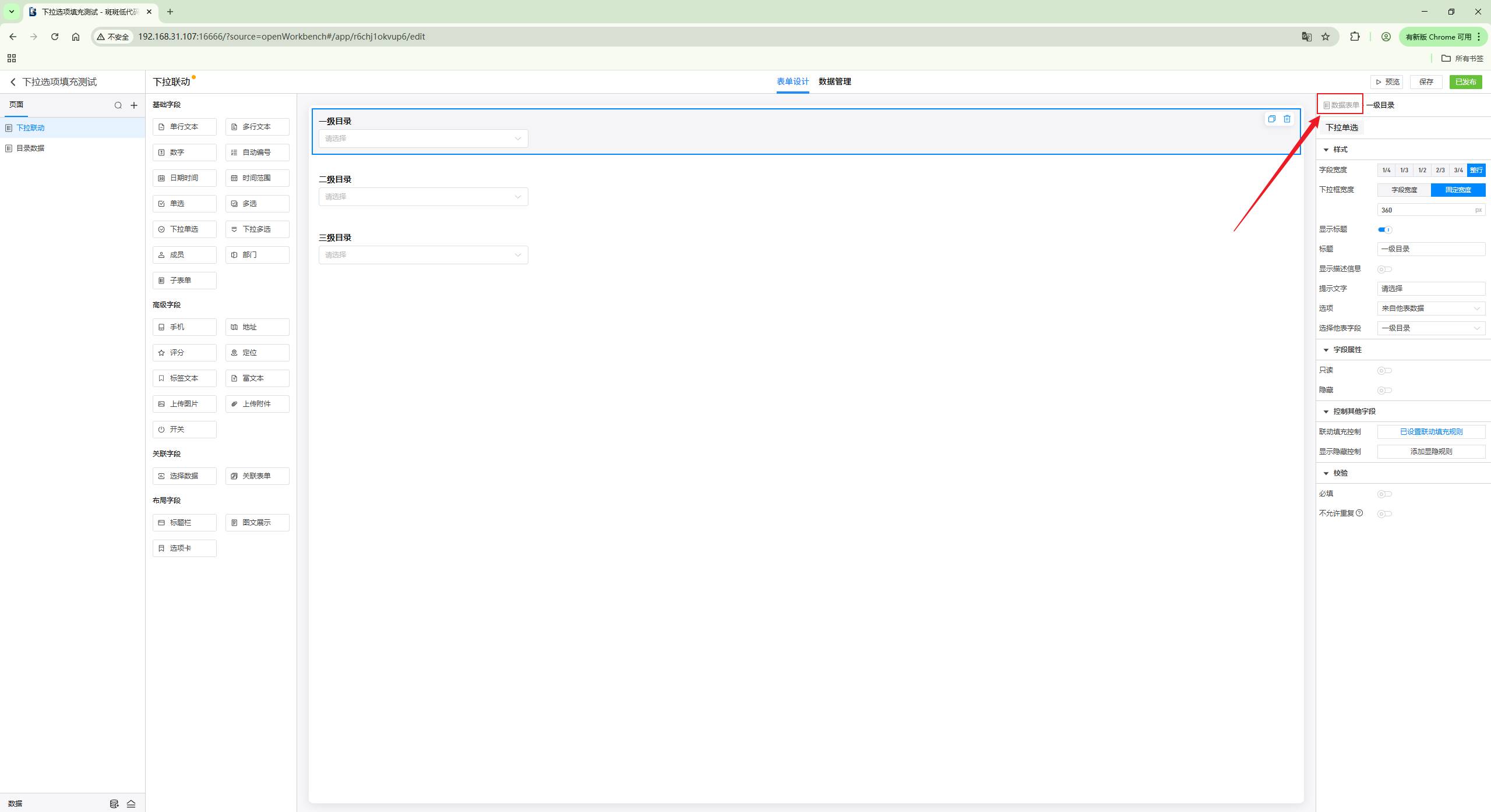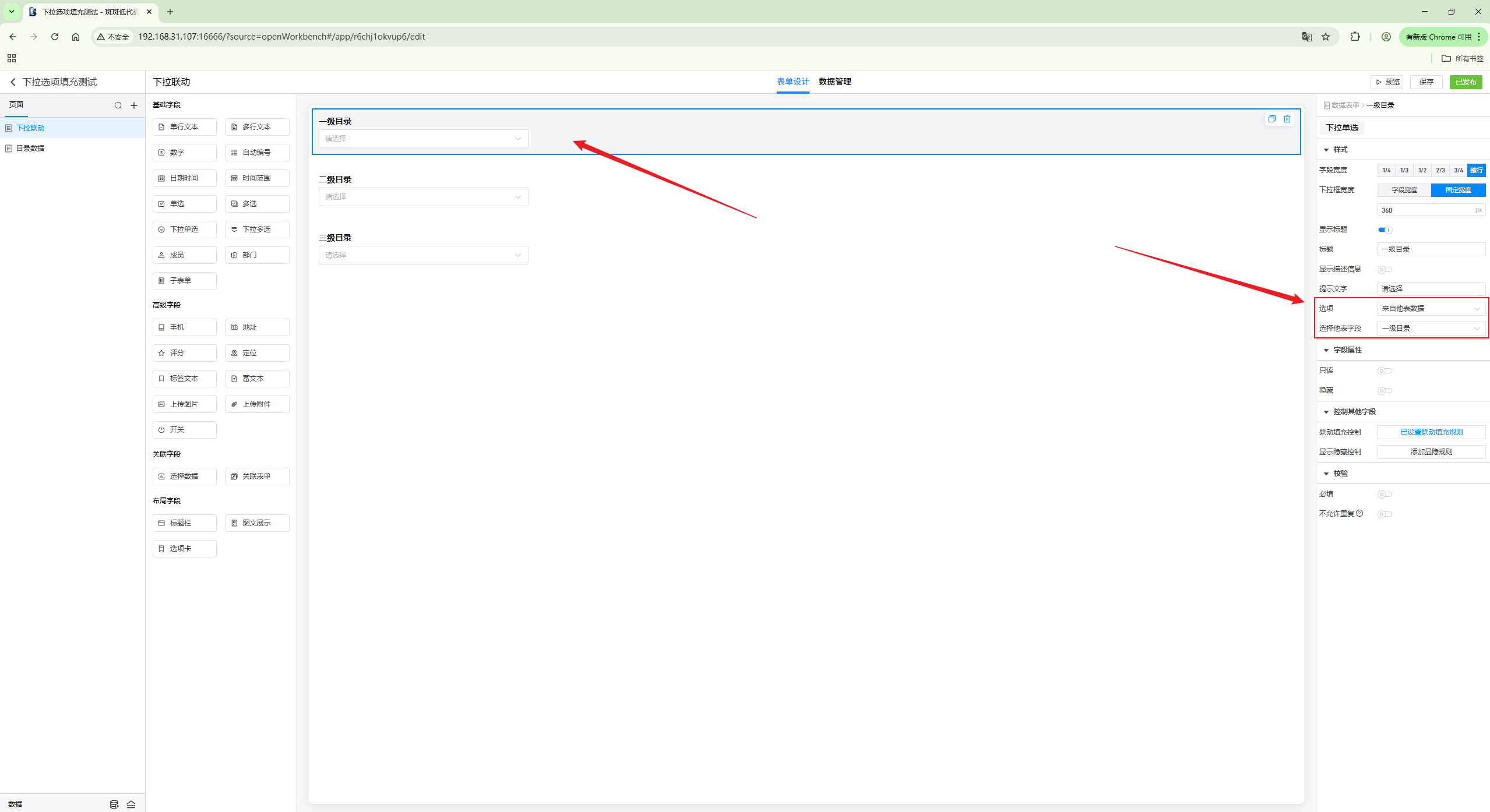 第一步:设置第一个下拉选项来自他表数据,选择对应的字段