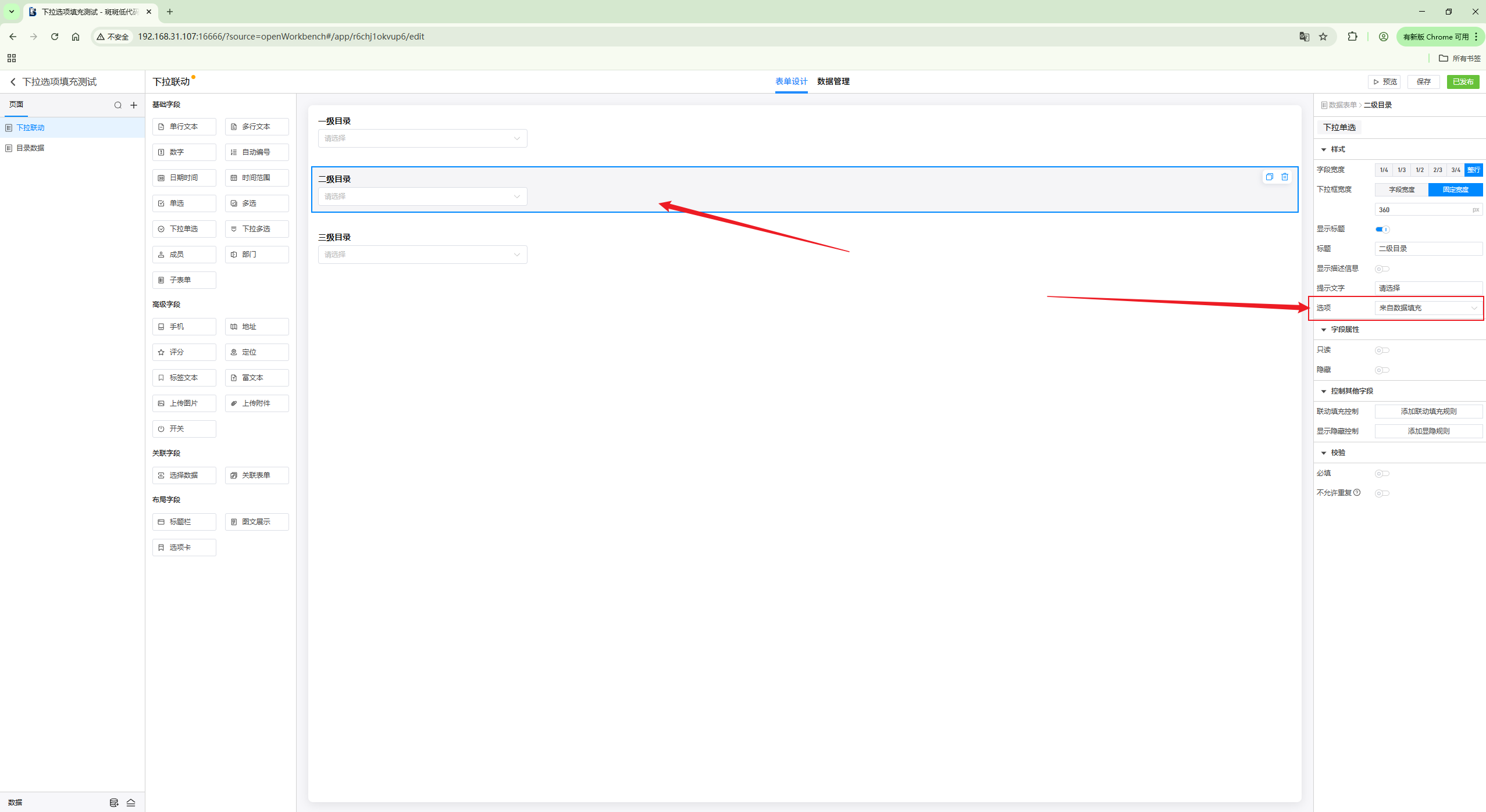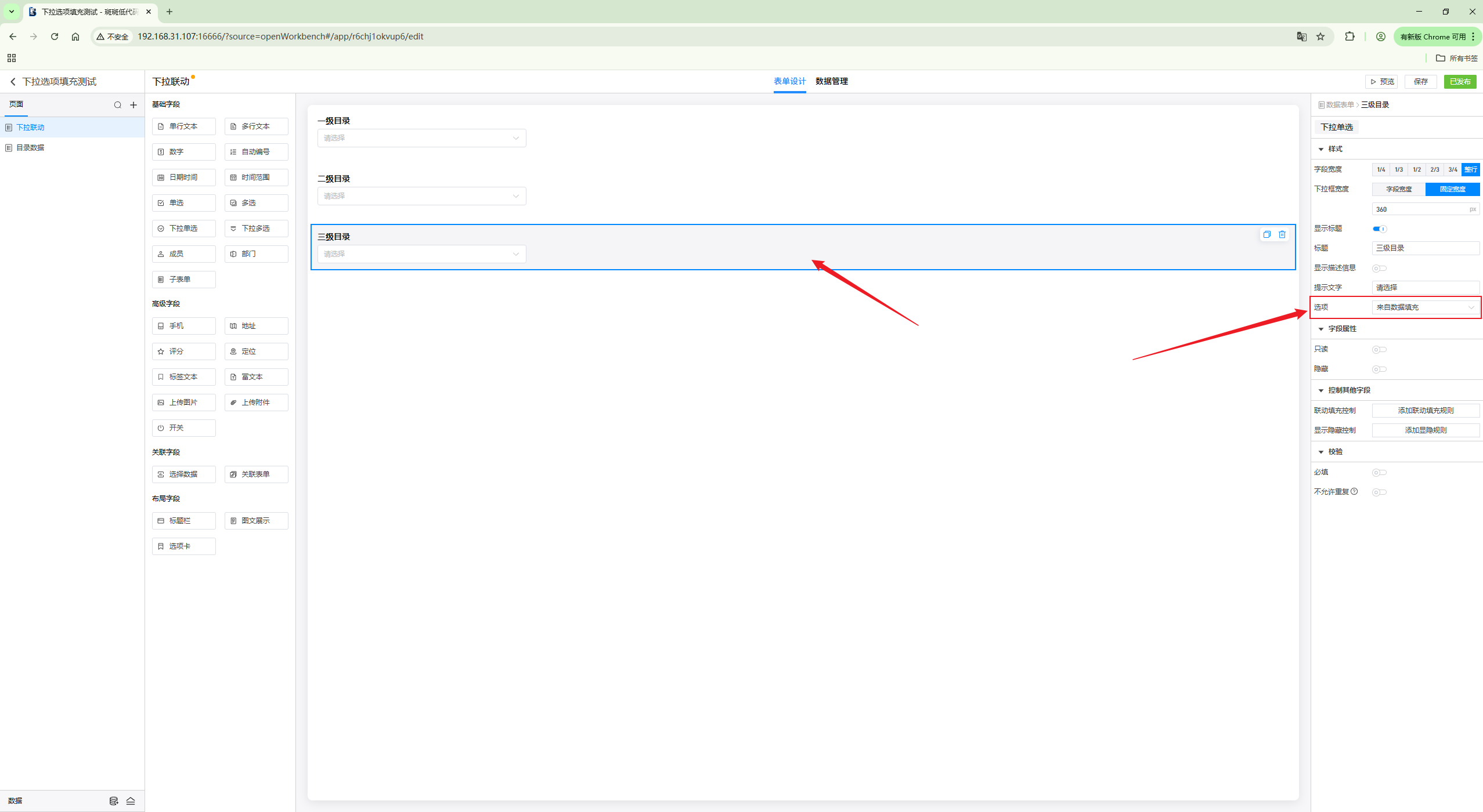 第二步:设置第二个下拉选项和第三个下拉选项的选项来自数据填充