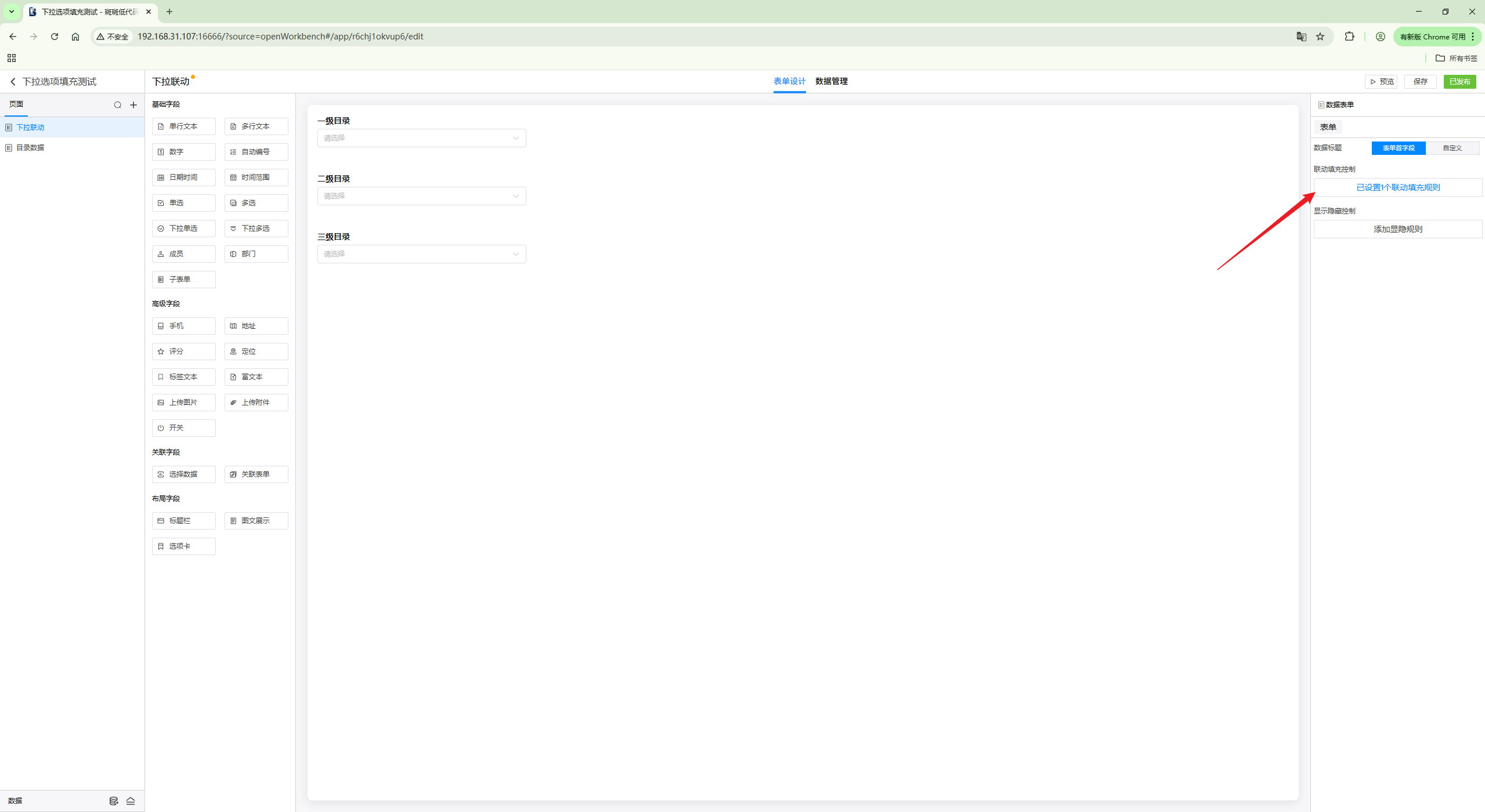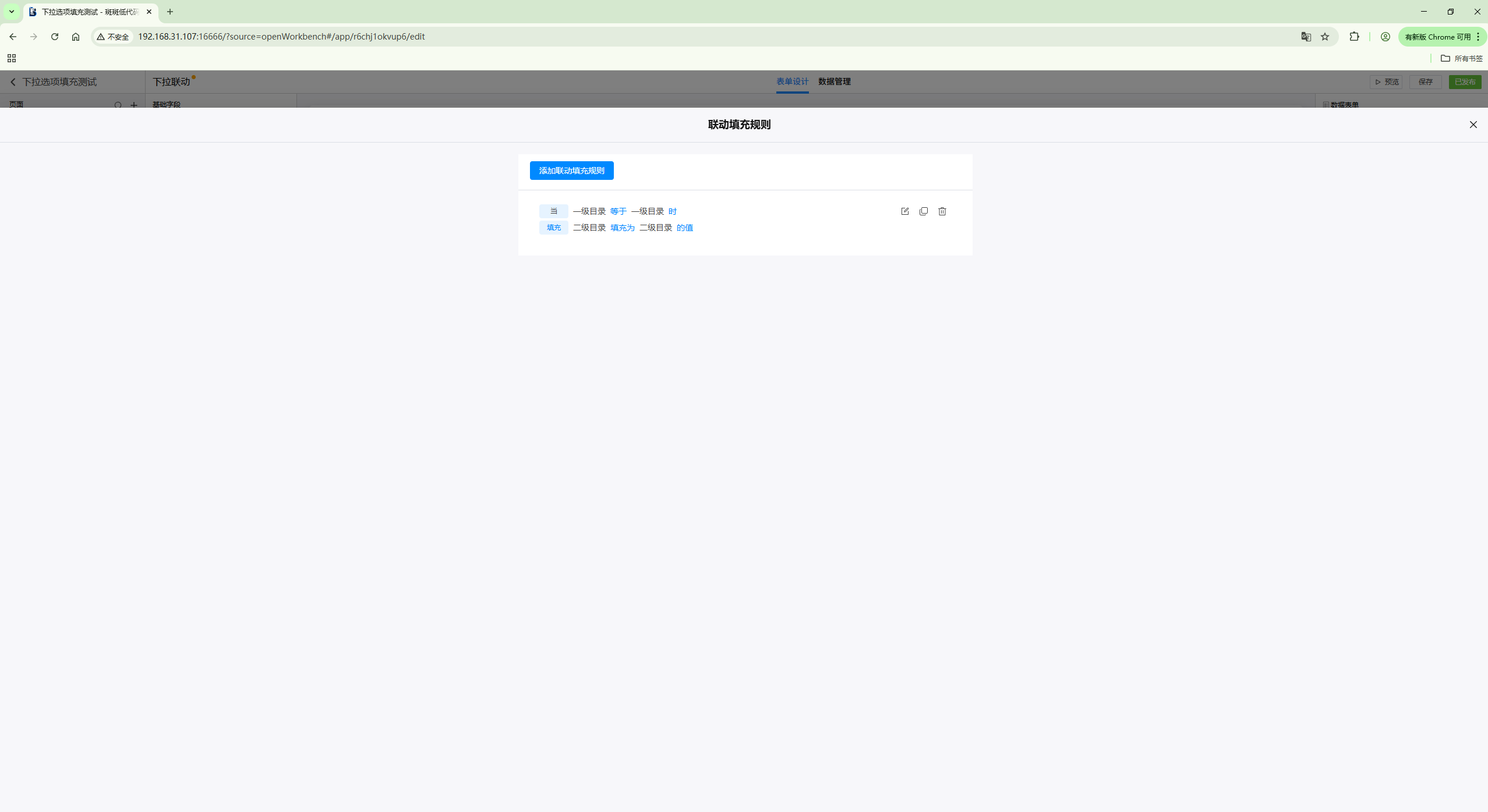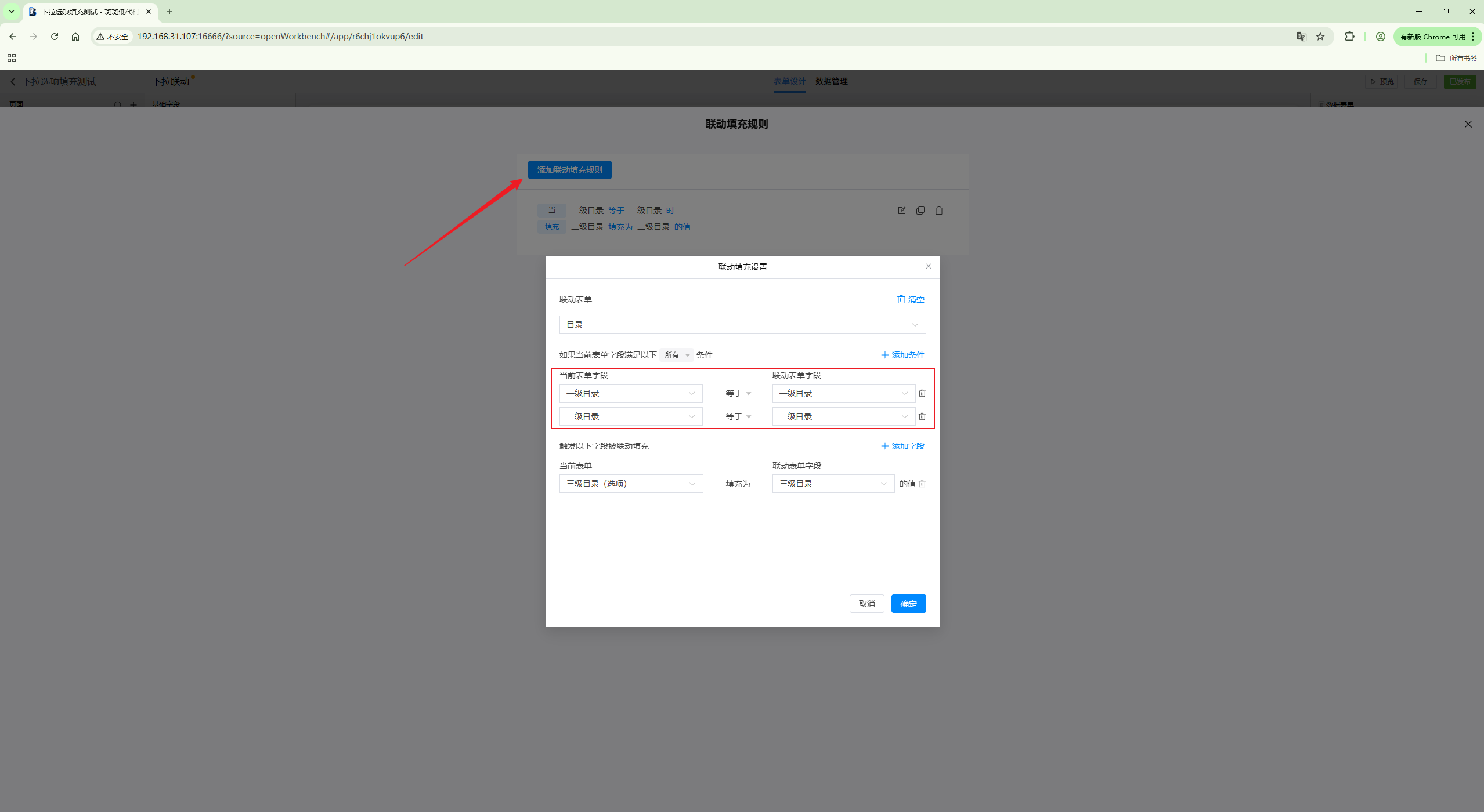 点击“添加联动填充规则”,添加一个由下拉选项一和下拉选项二同时满足条件时,对下拉选项三进行联动填充。