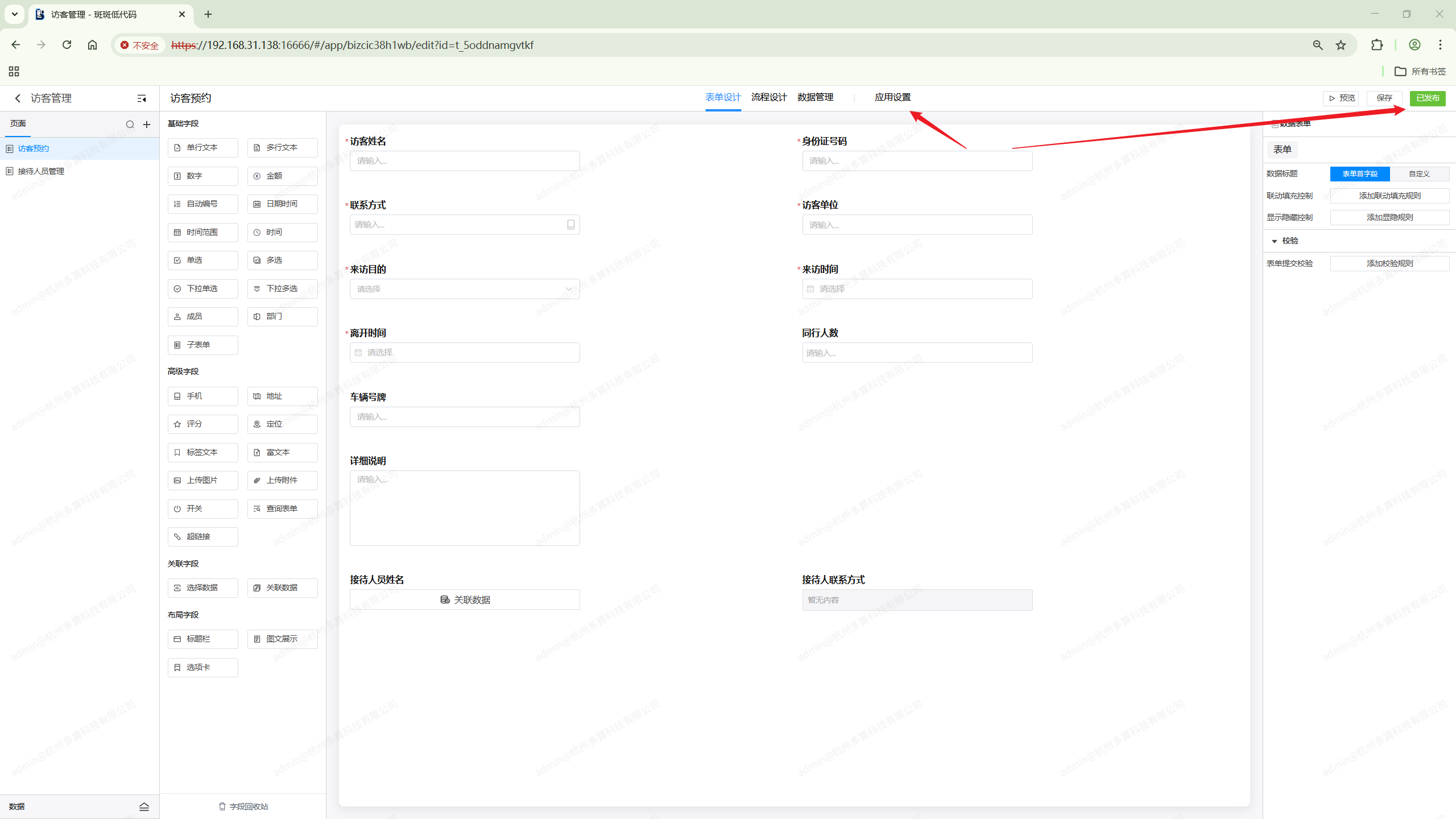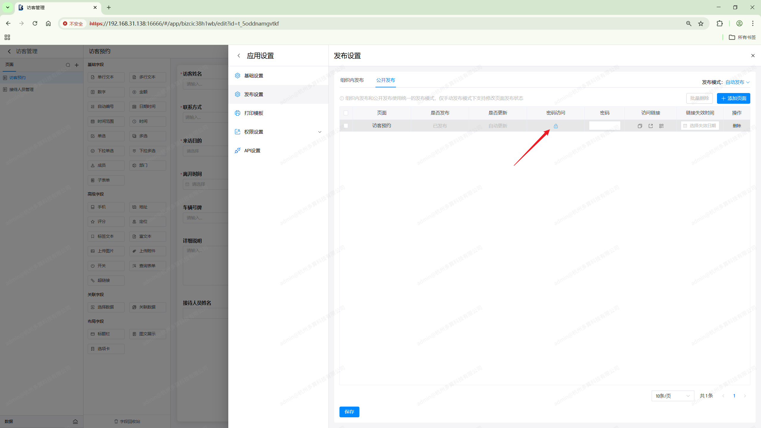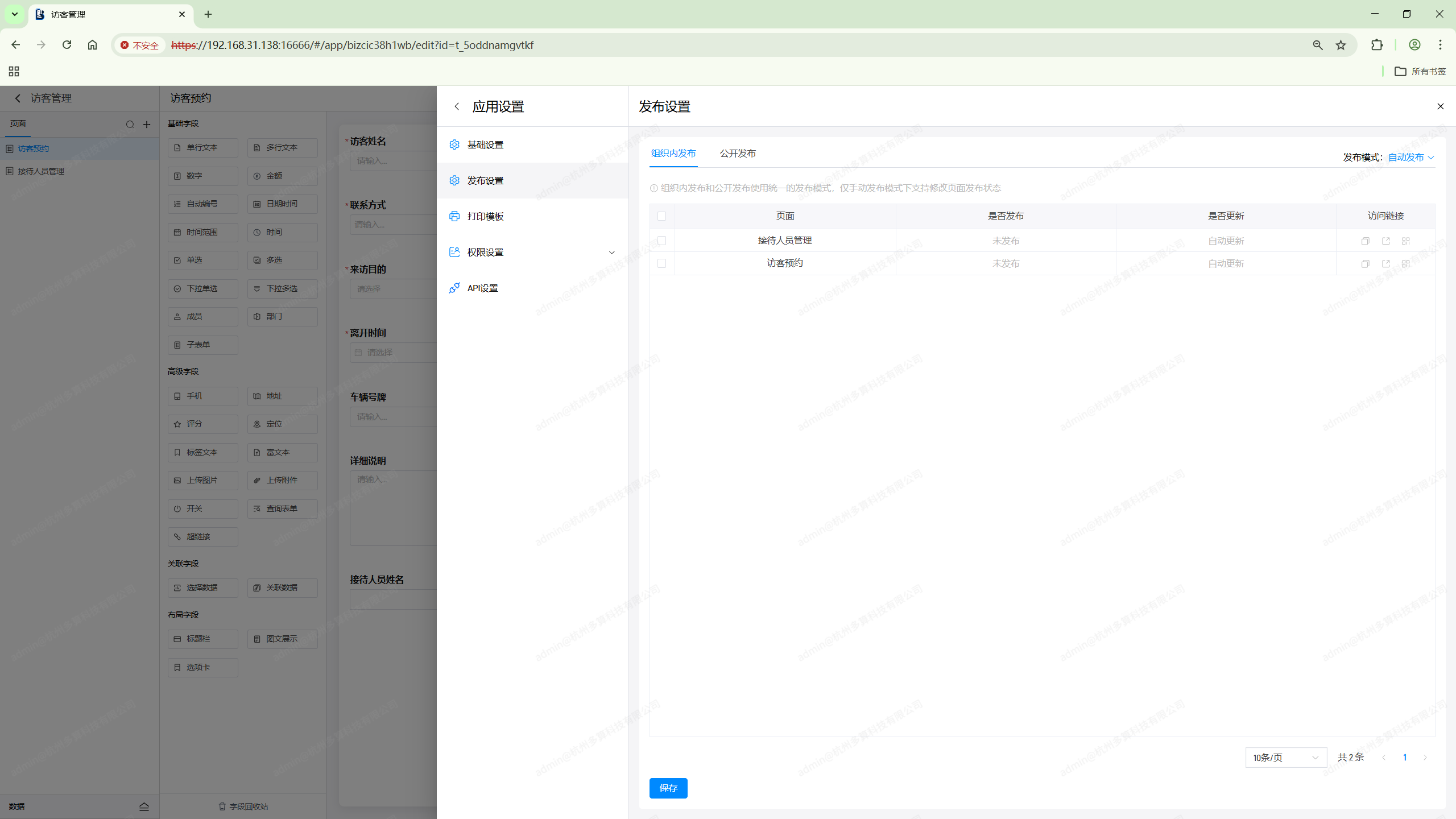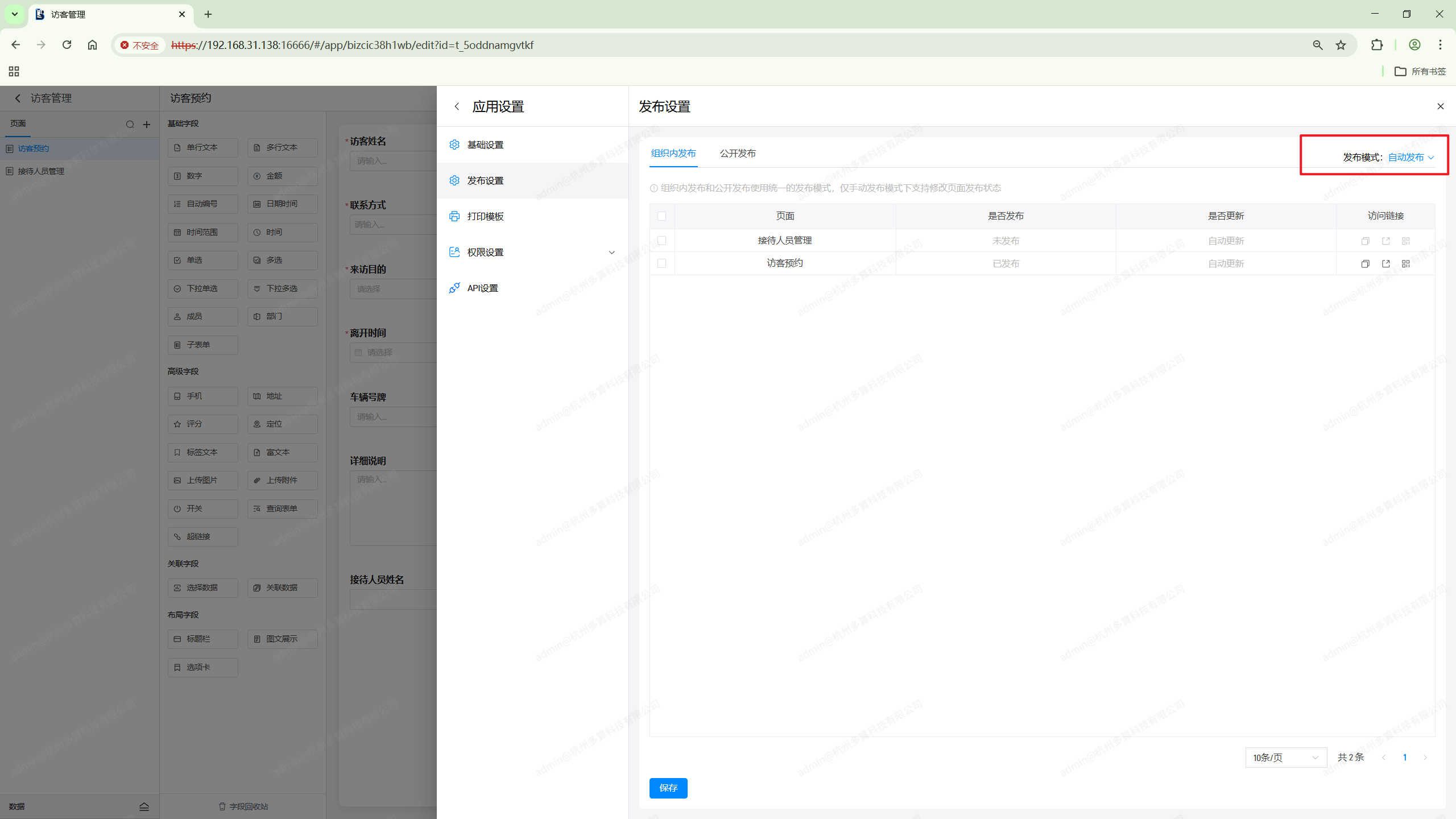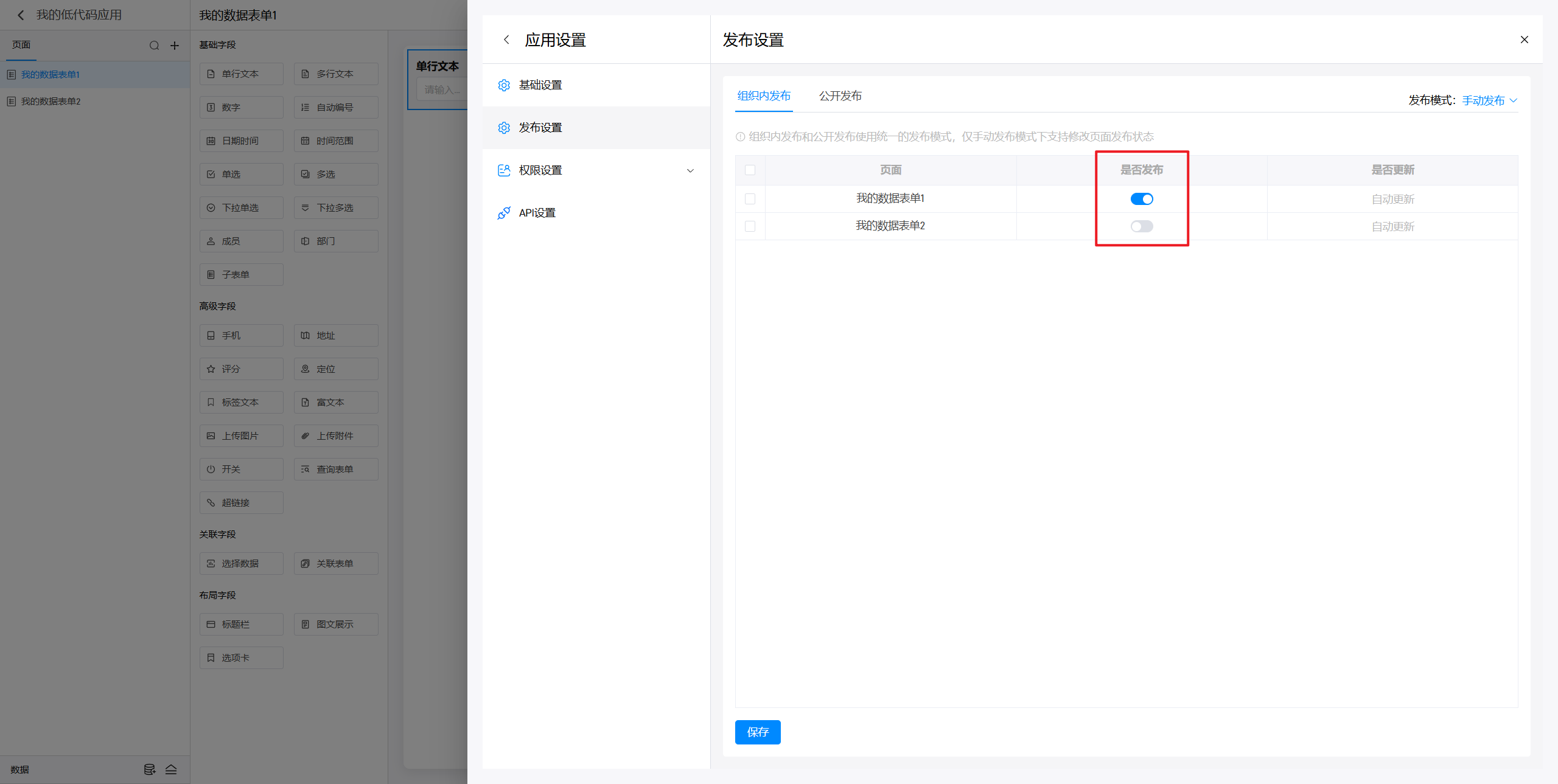 此时可以对页面的发布进行手动开启和关闭,关闭发布后在应用访问时就无法查看对应的页面了,只有进入应用编辑界面才能看到。