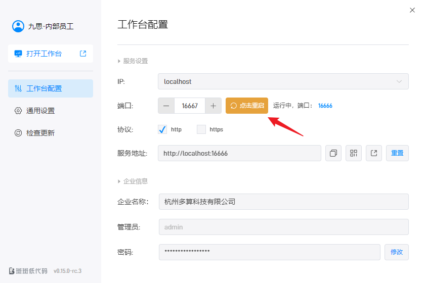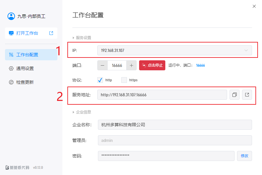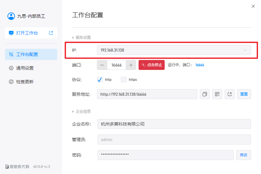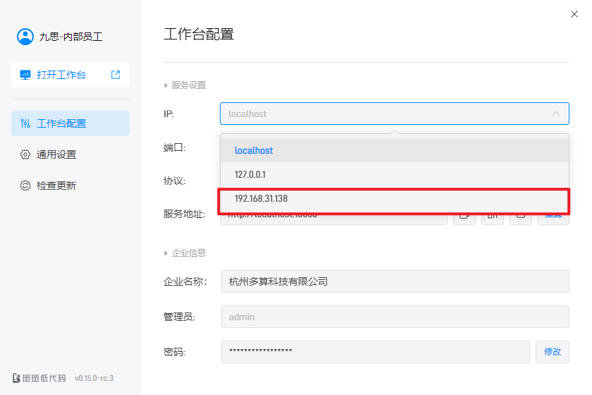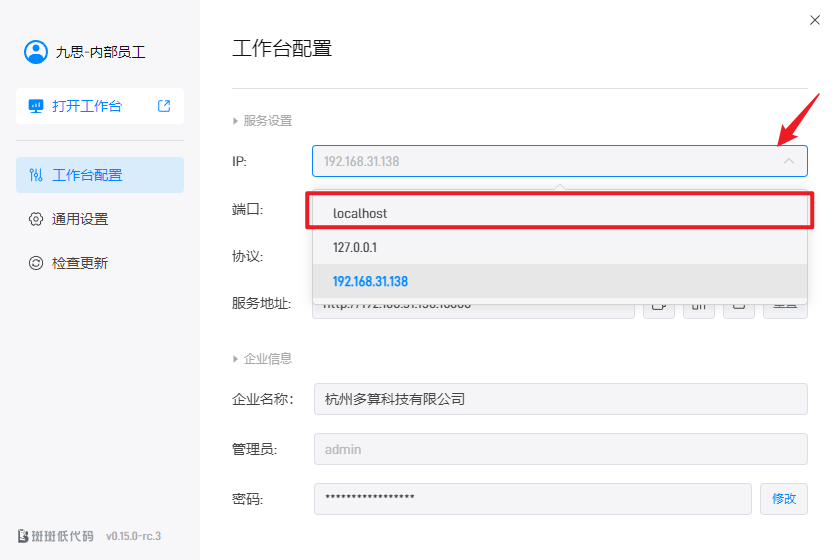 将 IP 切换到 localhost(localhost 和 127.0.0.1 都是仅在本机访问的 IP),然后在部署斑斑的本机打开工作台。