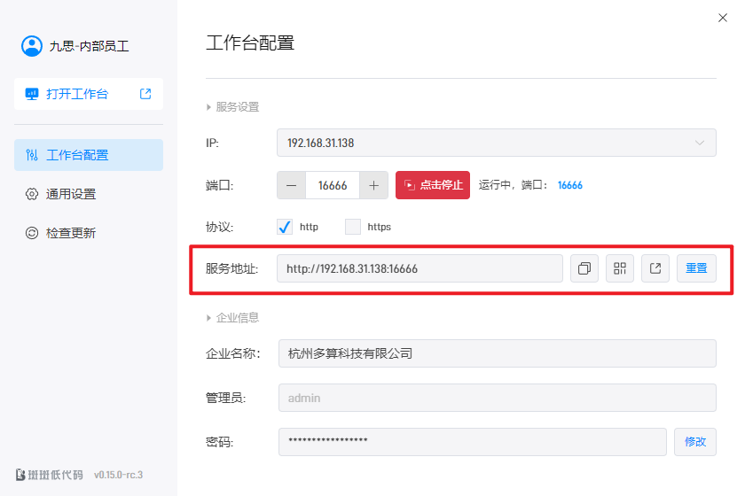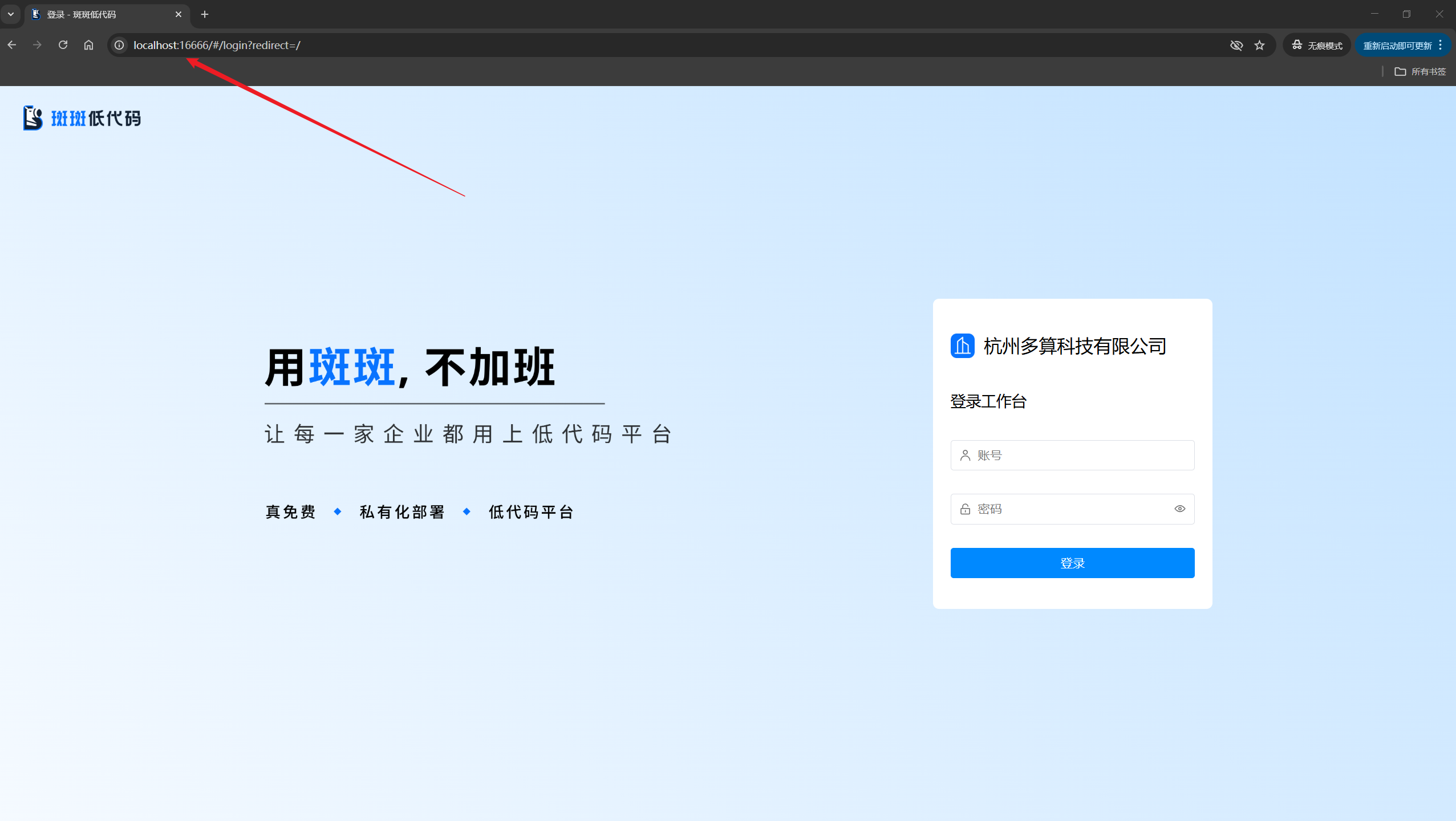 斑斑是一款本地私有化部署的低代码平台,如果你将斑斑部署在本地电脑/服务器中,那么工作台的访问链接就是一个局域网链接,只有相同局域网的用户才可以访问。