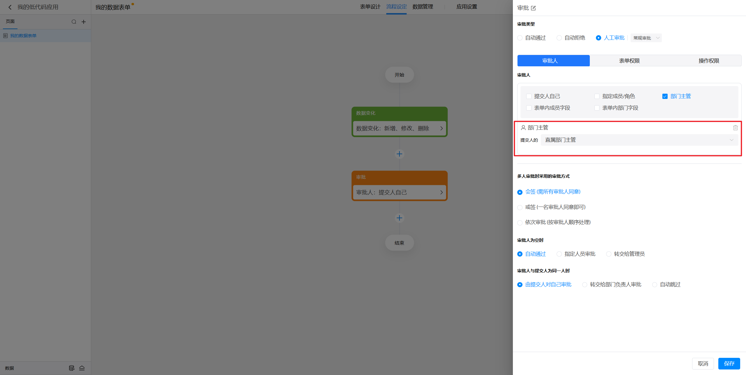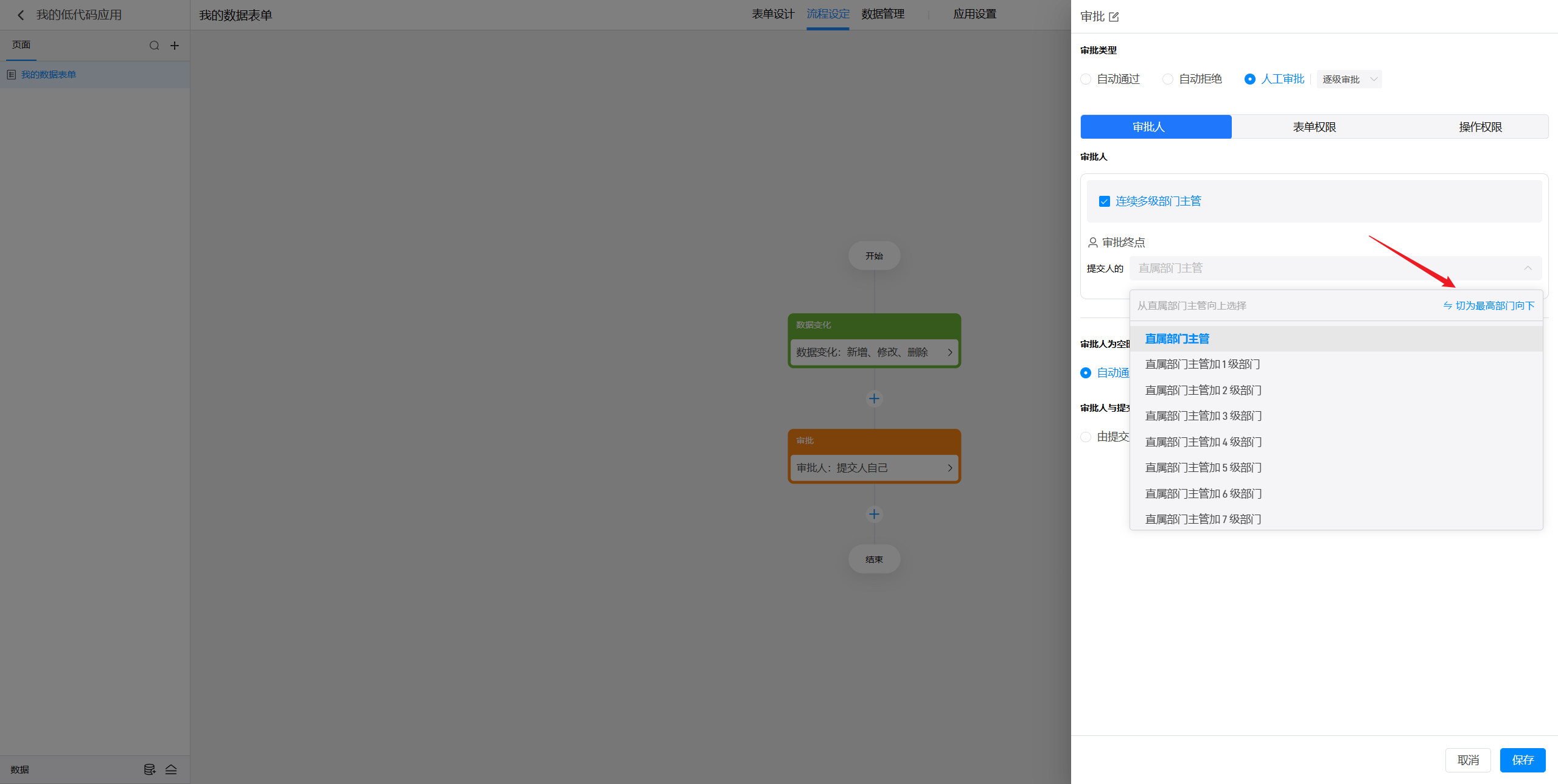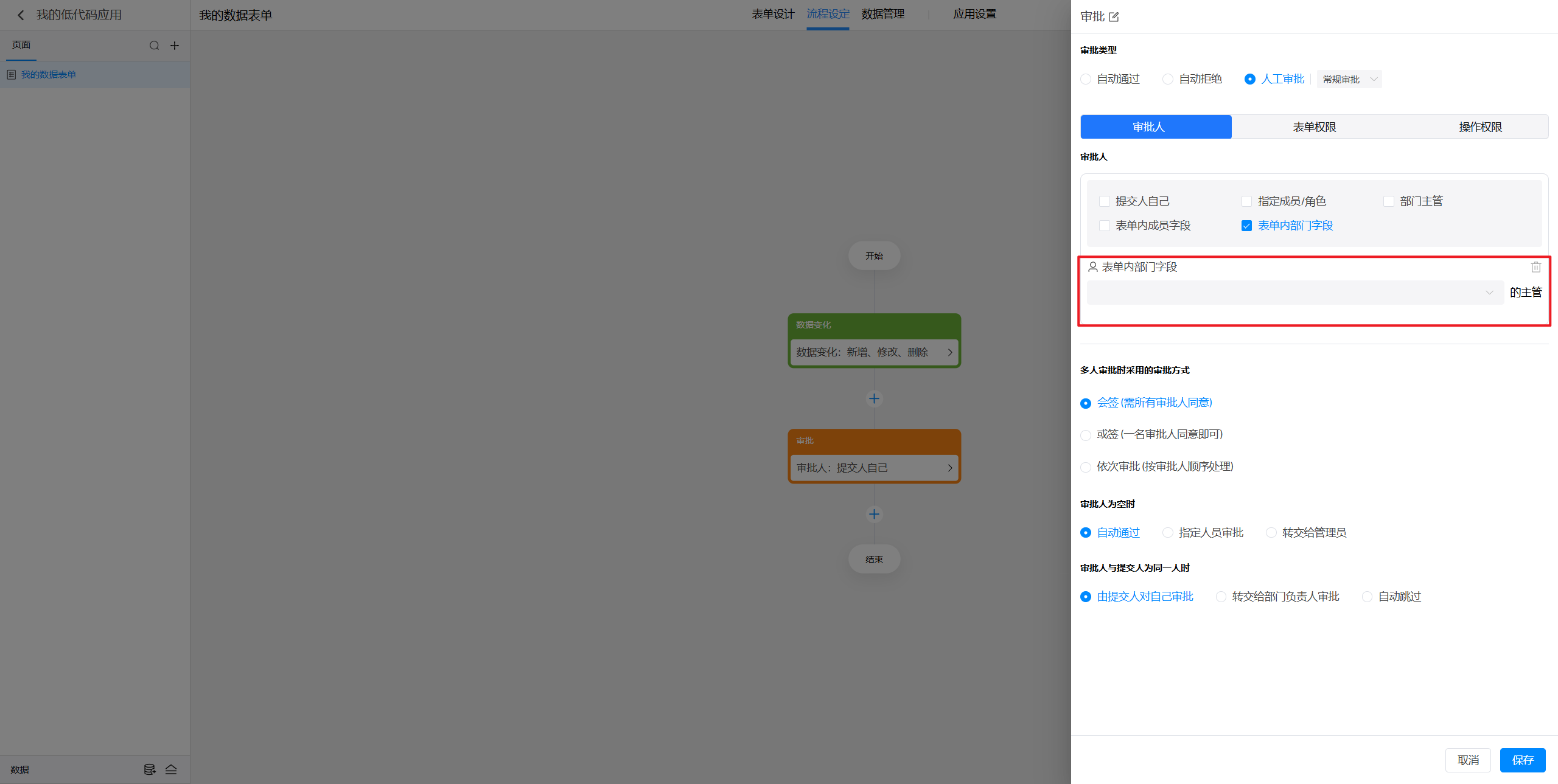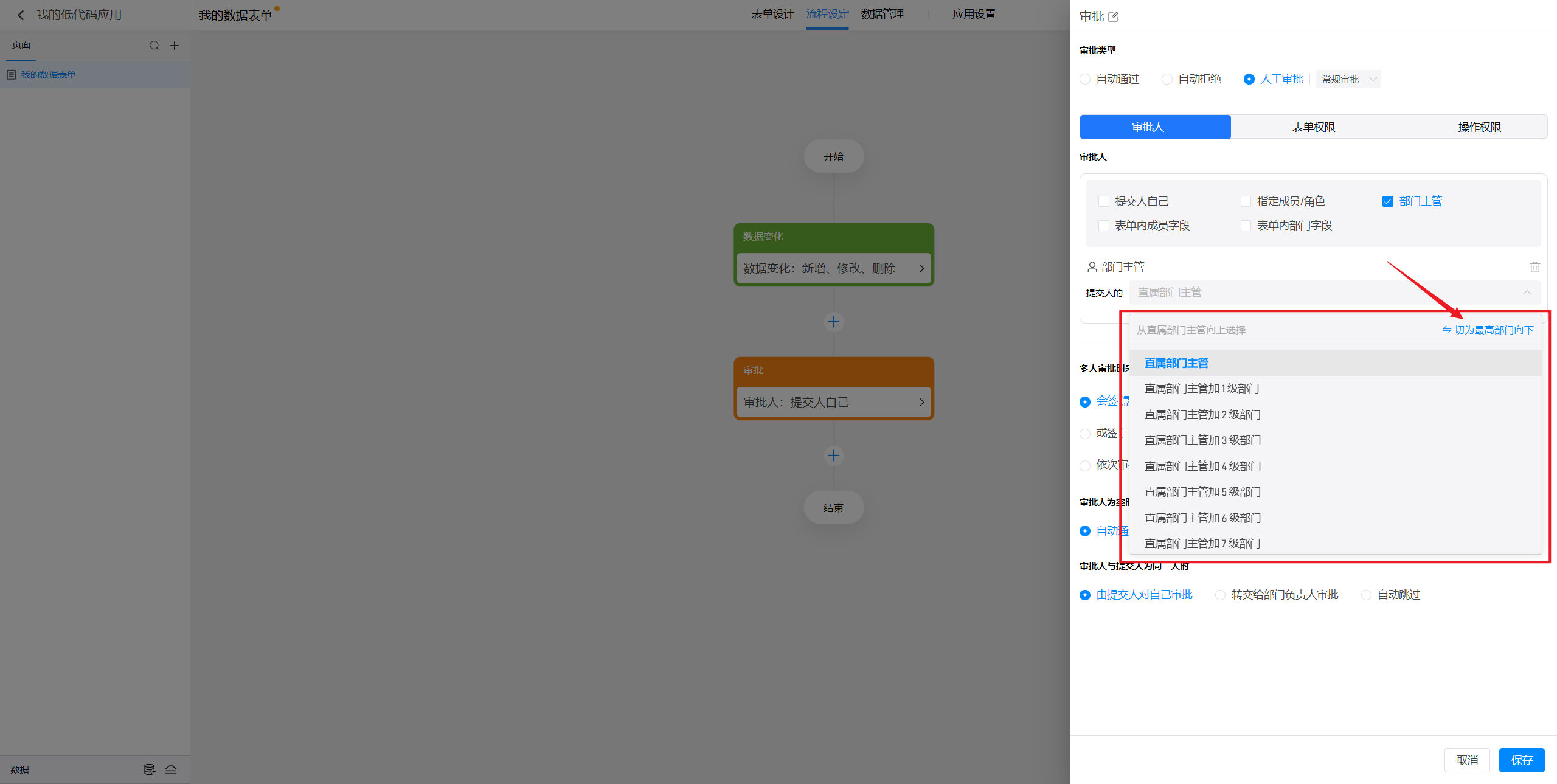 (5)表单内部门字段:指的是在当前表单中添加的某个部门字段所选择的部门的主管进行审批