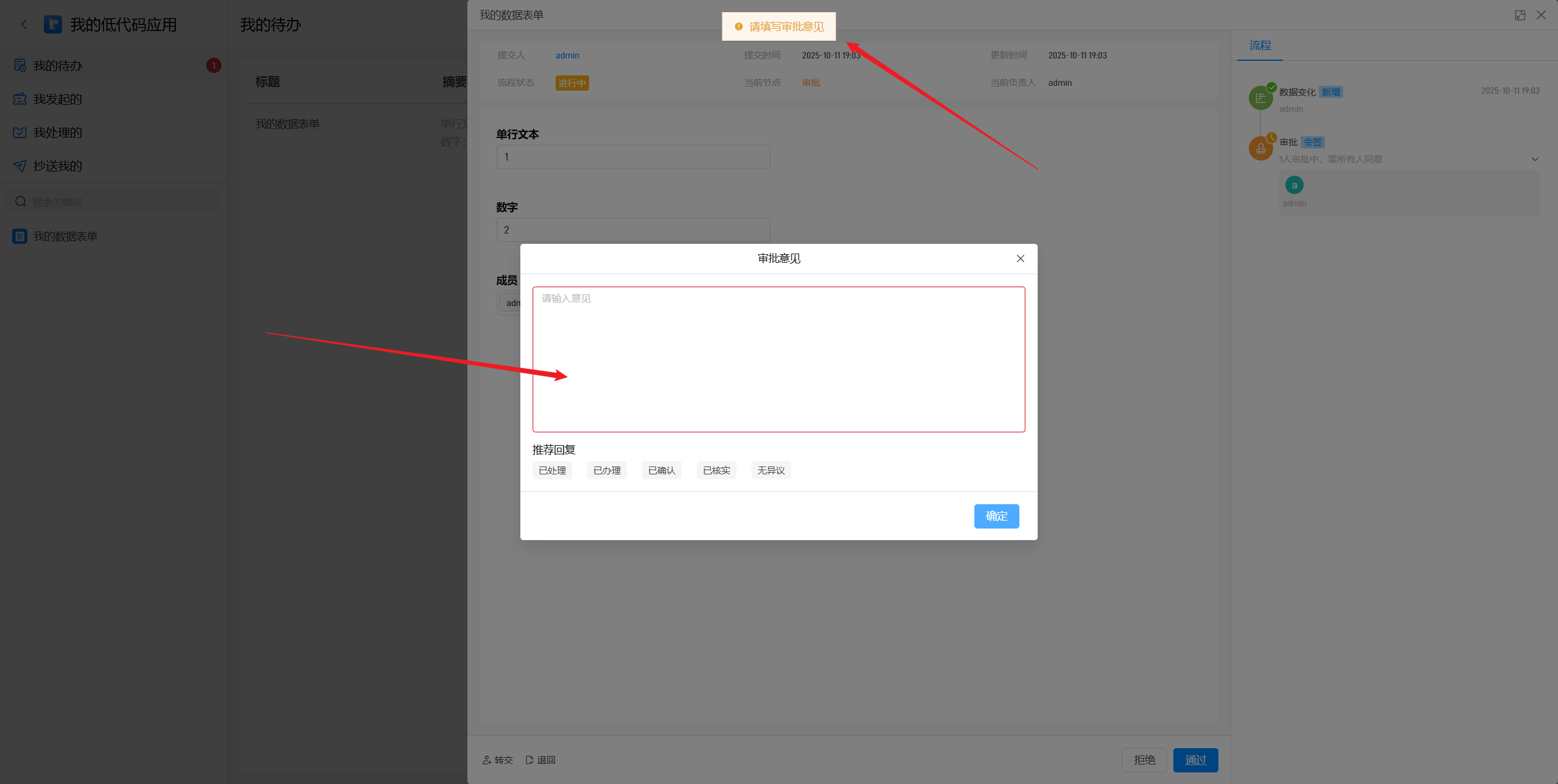 在审批时,可以填写审批意见,如果这里勾选了“提交时必须填写审批意见”,则审批时就是必填项,不可以留空,否则无法提交。