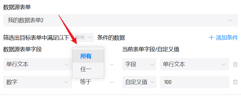 这里可以将数据源表单字段与当前表单字段相比较,也可以将数据源表单字段与自定值相比较,判断条件包括:等于/不等于/等于任意一个/不等于任意一个/包含/不包含/为空/不为空,具体和选择的数据源表单字段有关。