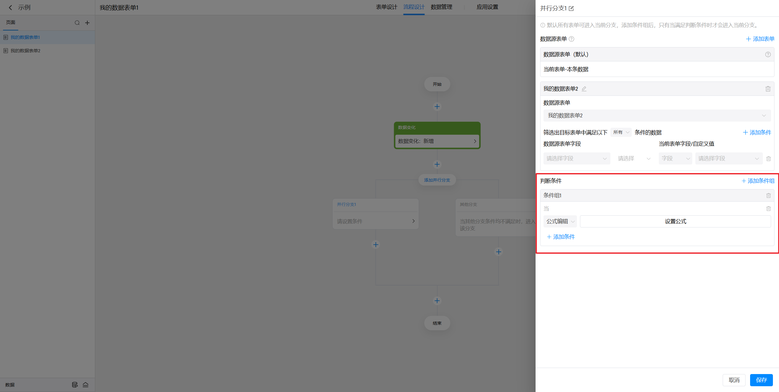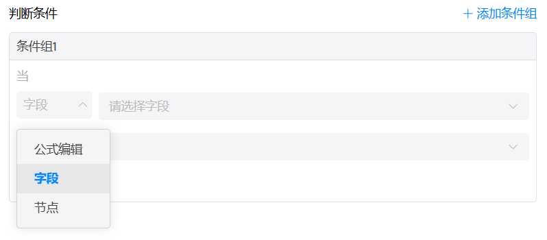 这里可以对字段(来自上面设置的数据源表单)进行直接判断,也可以通过编辑公式进行判断,或者基于触发节点(只适用于数据变化触发)的类型进行判断。
