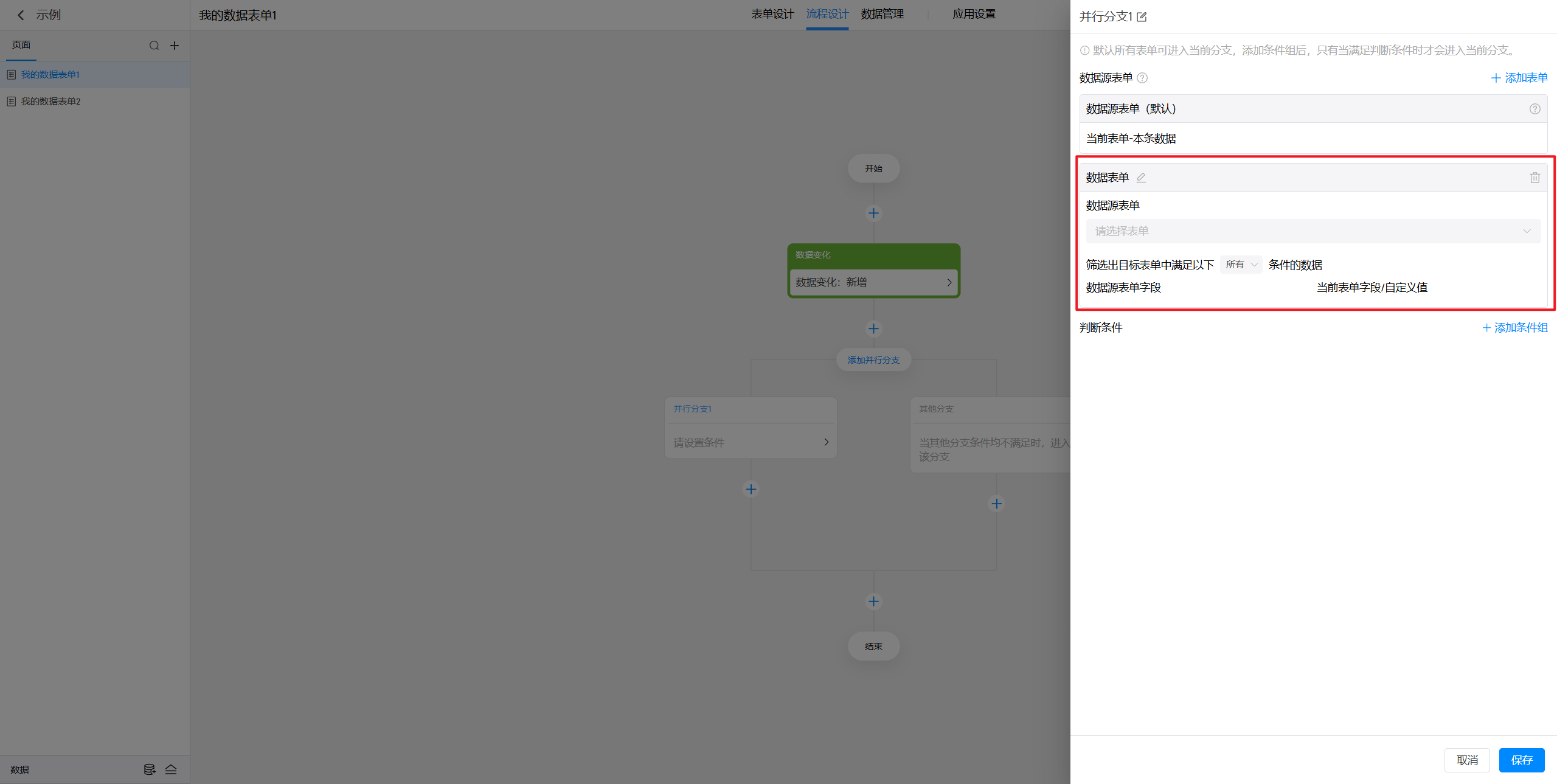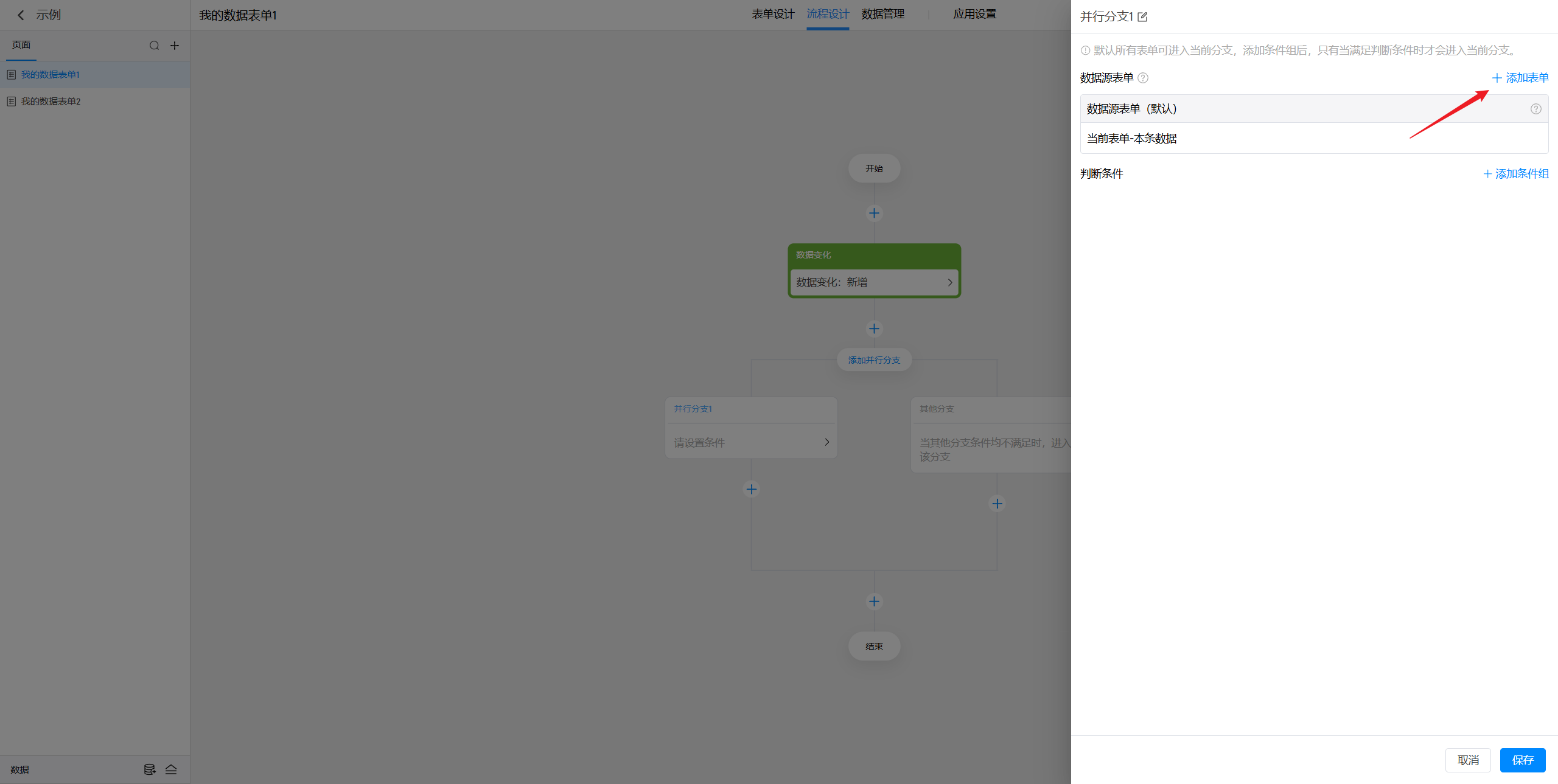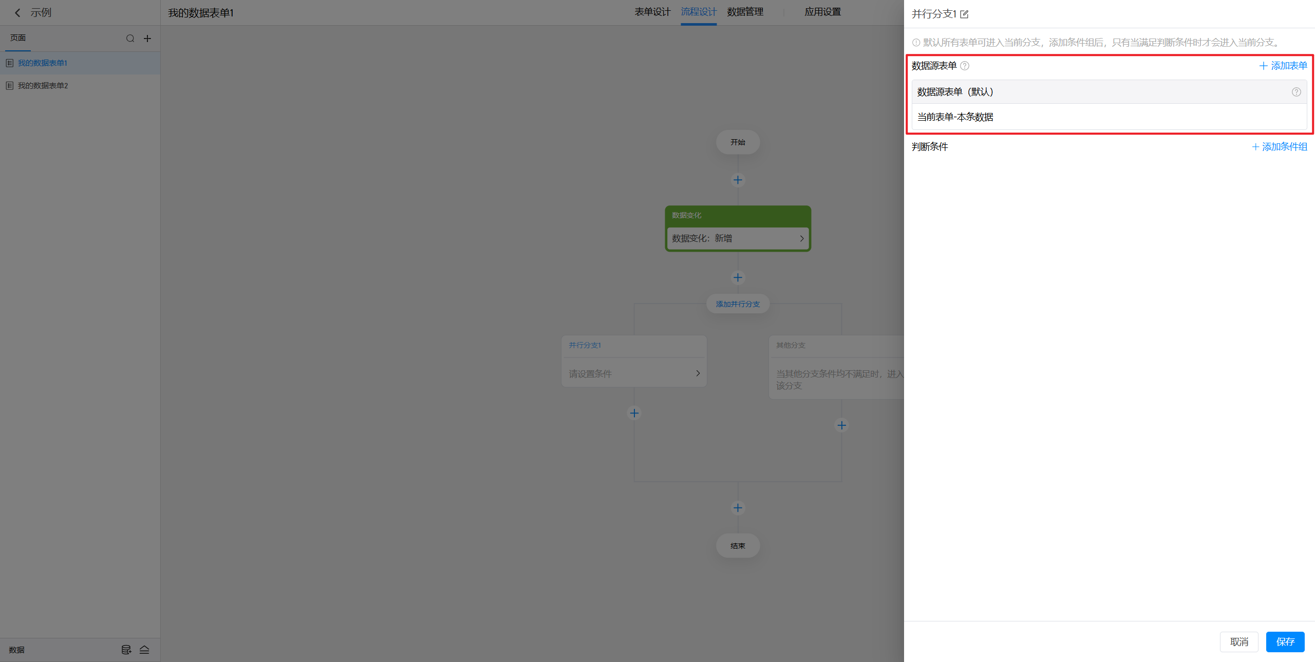 在设置分支的判断条件时,我们可能会用到一些数据作为判断条件,默认可以使用当前表单的本条数据(对于触发节点的新增/修改/删除某条数据),如果还需要使用其他的数据,就可以在这里进行添加。
