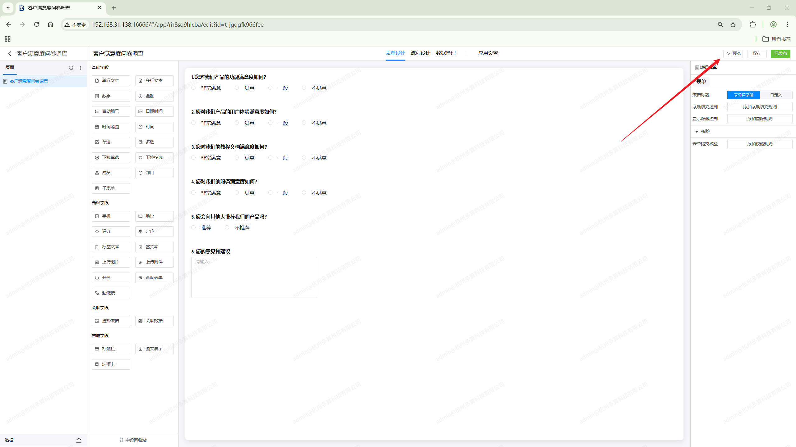 完成表单制作后,我们可以点击右上角进行预览,预览界面可以测试表单,但是这里的数据无法提交和保存。