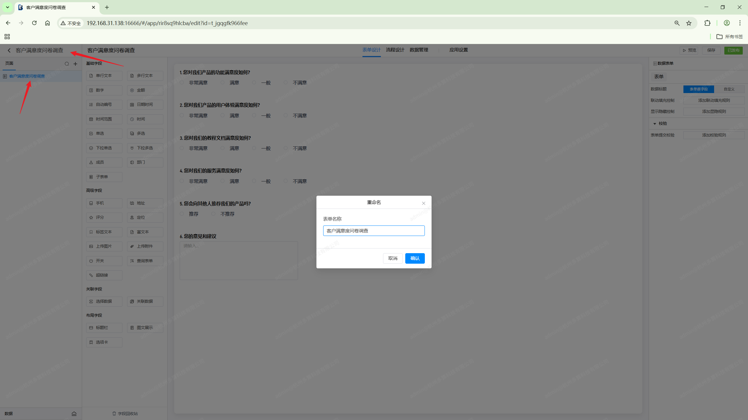 最后我们可以修改一下应用的名称和表单的名称,双击左上角的应用名称可以直接进行修改,右击数据表单可以进行重命名。