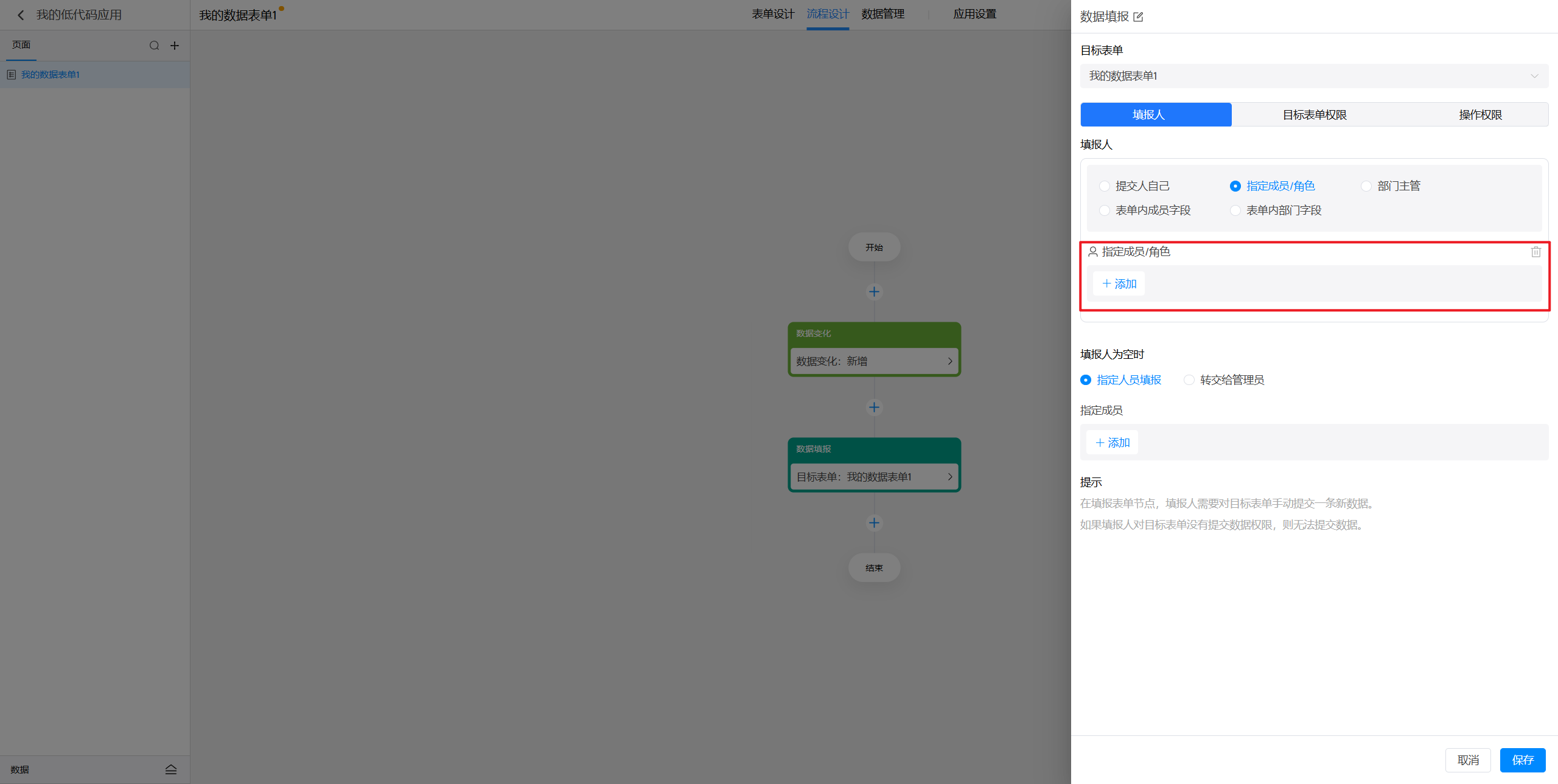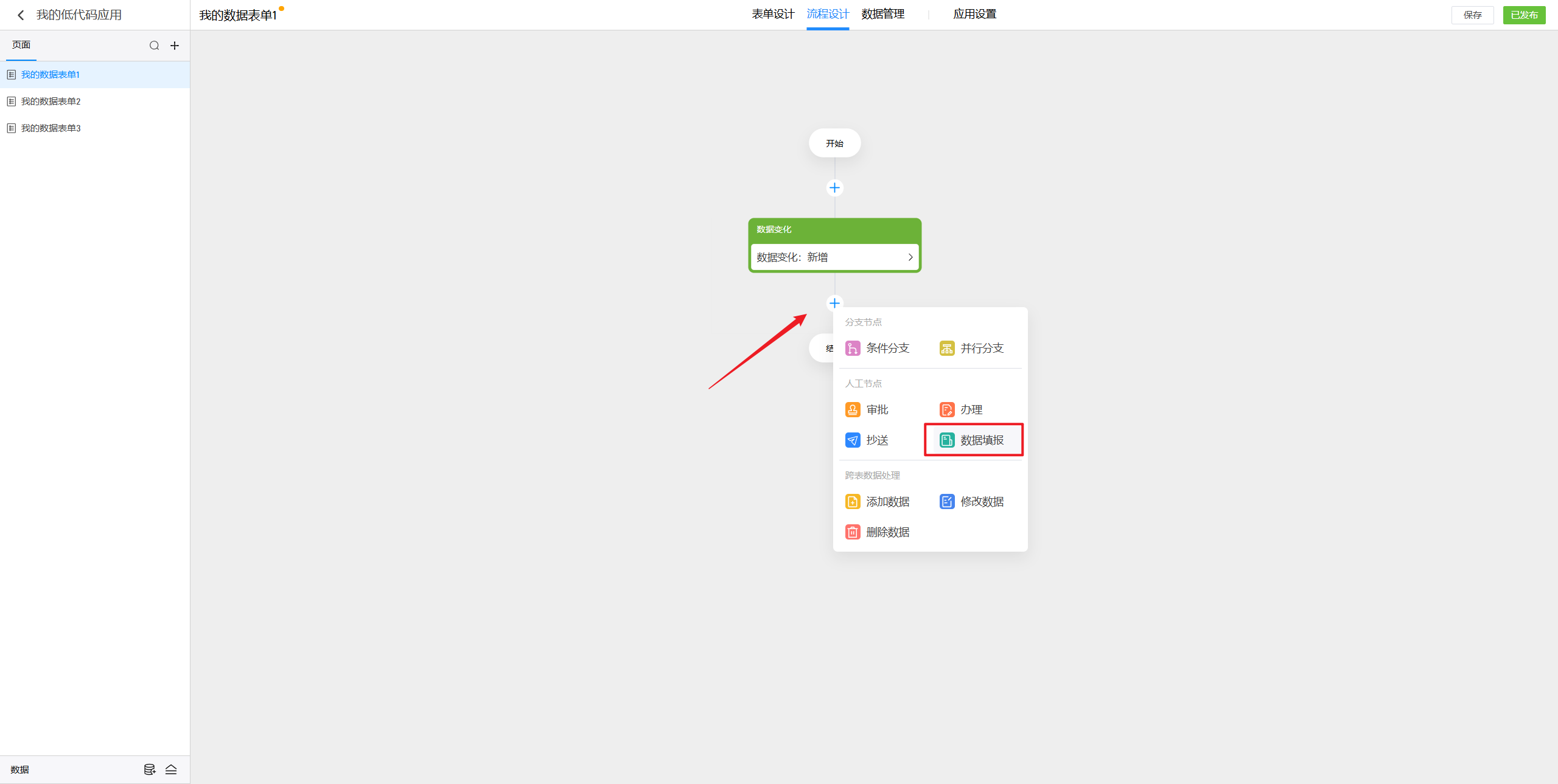 在添加触发节点后,就可以在任何位置添加数据填报节点了。