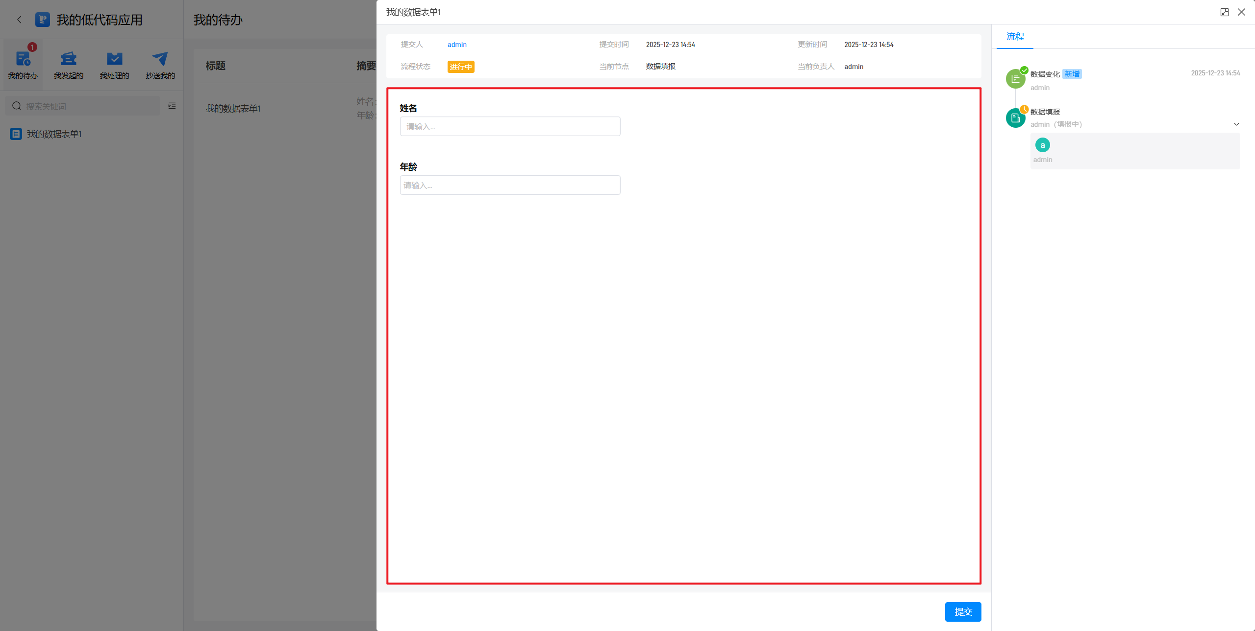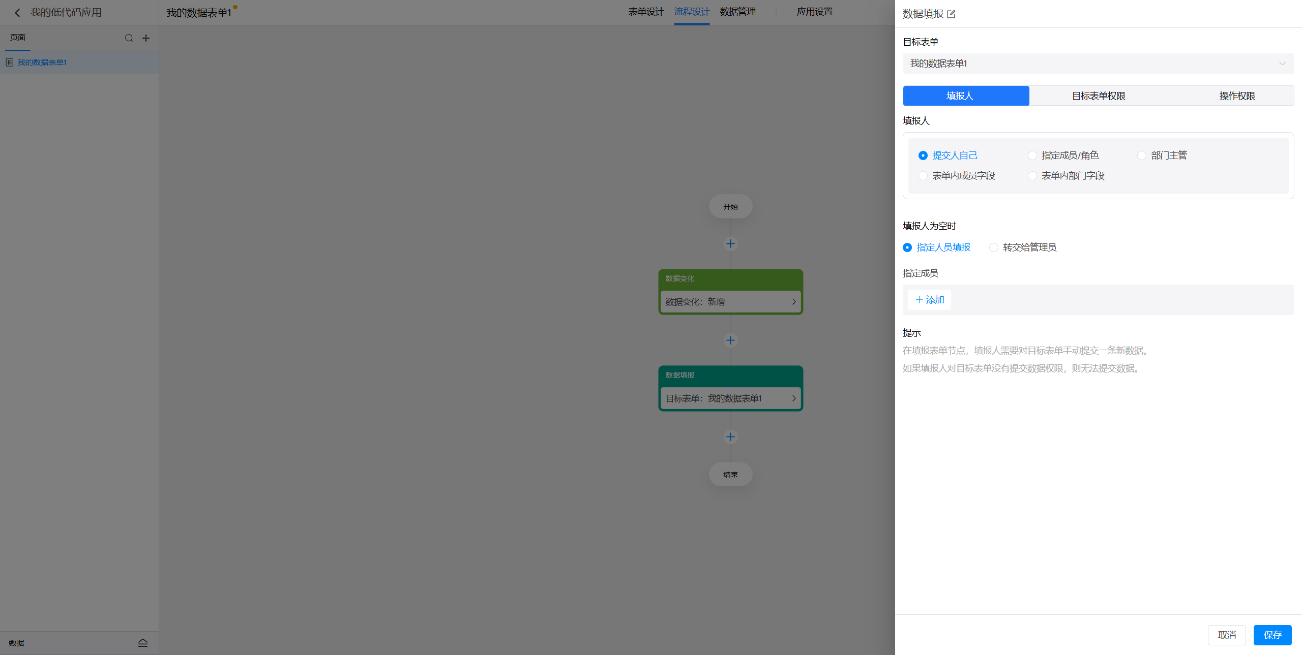 数据填报节点主要用来进行流程中**提交新数据**的操作(通常是向其他表单提交一条新数据),比如:在当前表单录入一条客户信息后,需要继续提交后续的客户跟进记录,客户跟进记录是其他表单,在当前表单可以通过查询看到客户跟进记录表单数据。