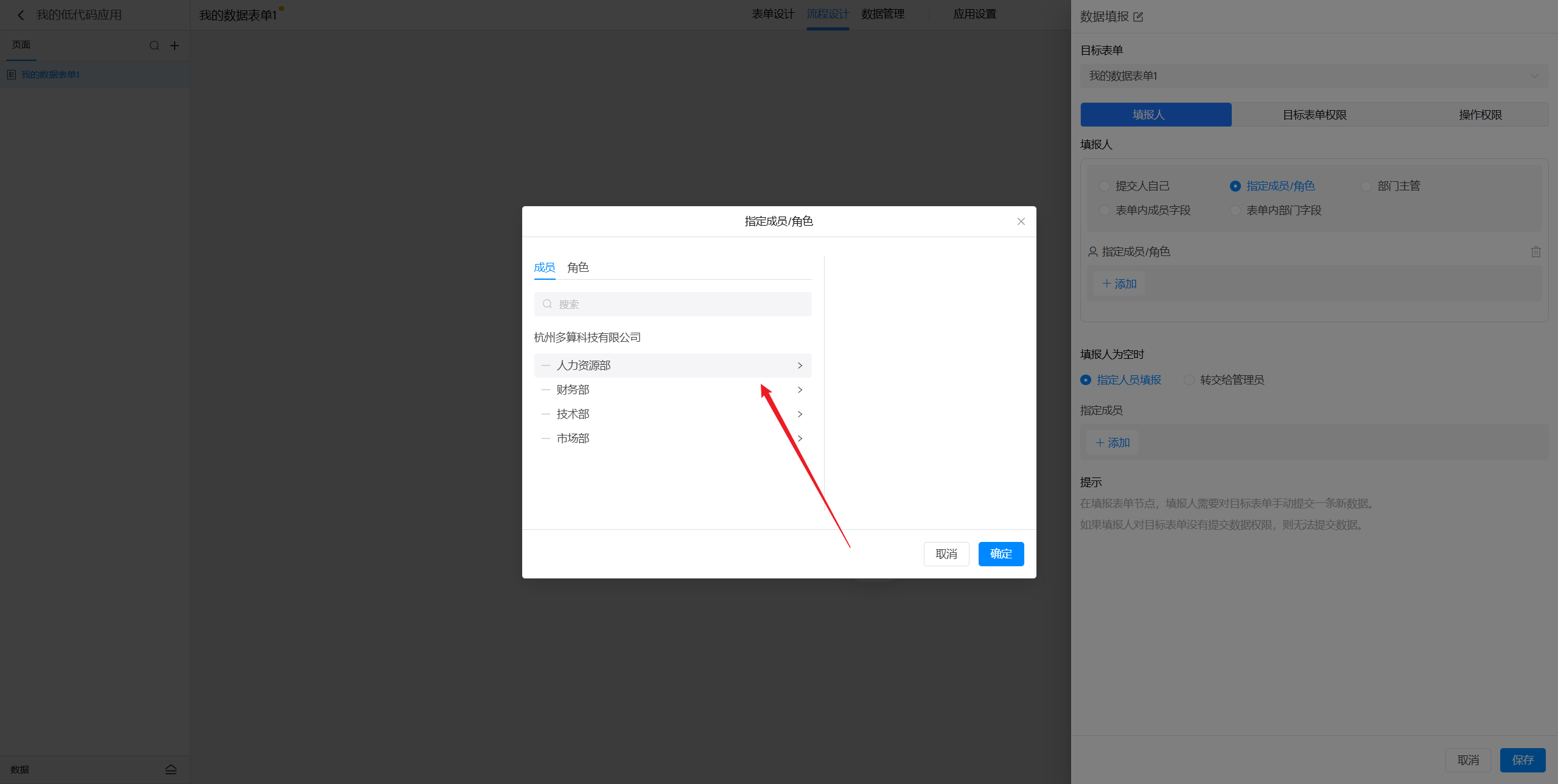 需要注意的是,这里只能选择成员,所以需要点击部门右侧的按钮进入部门内部才能选择部门内的成员。