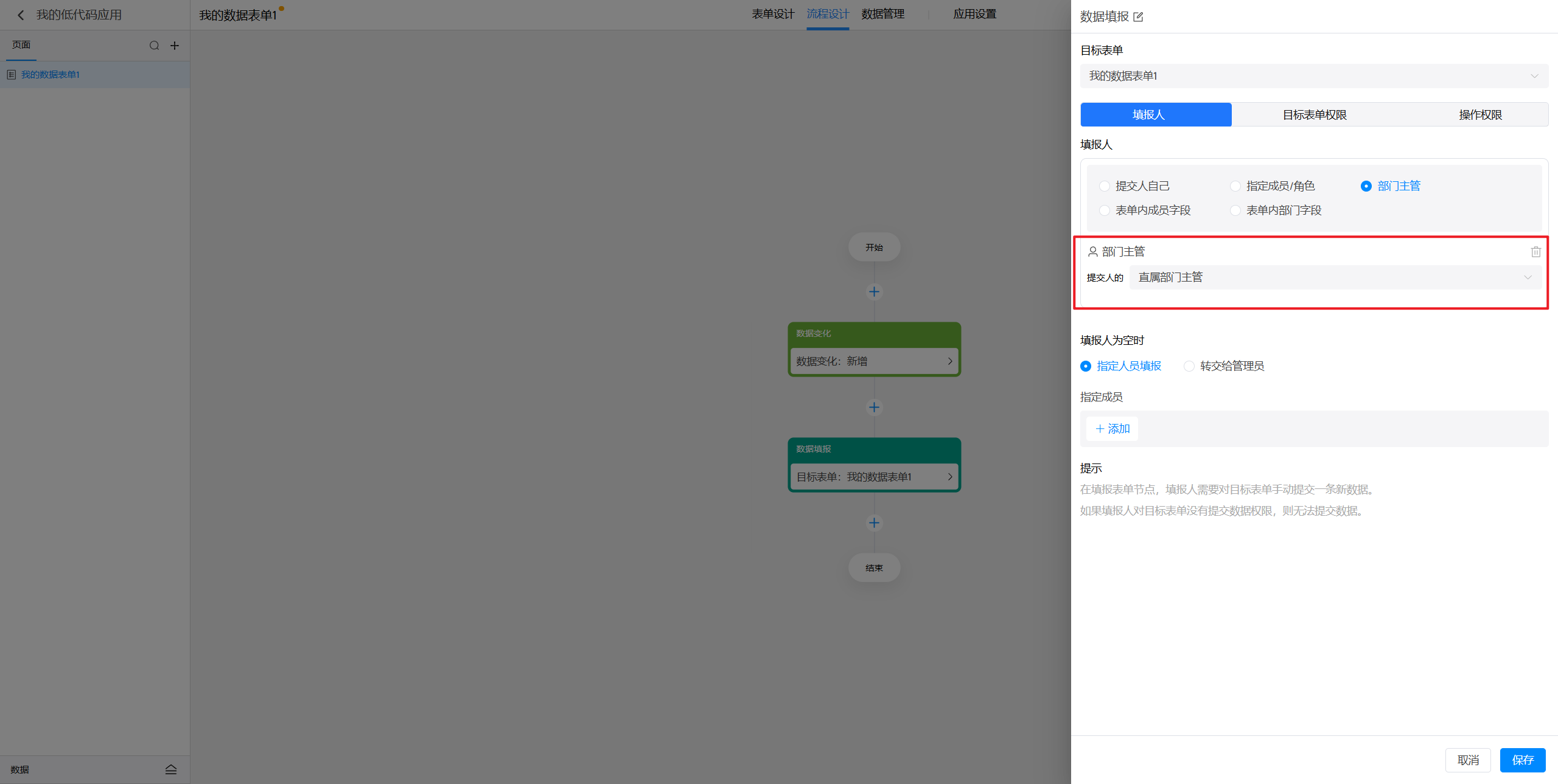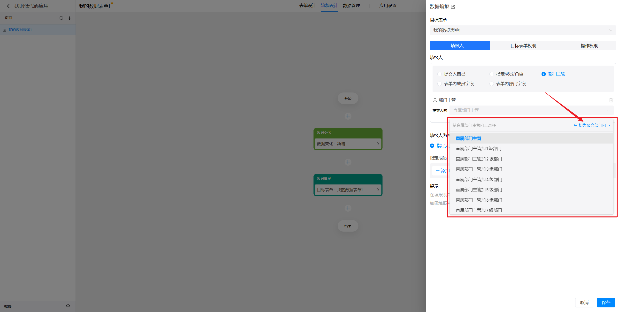 (5)表单内部门字段:指的是在当前表单中添加的某个部门字段所选择的部门的主管进行办理