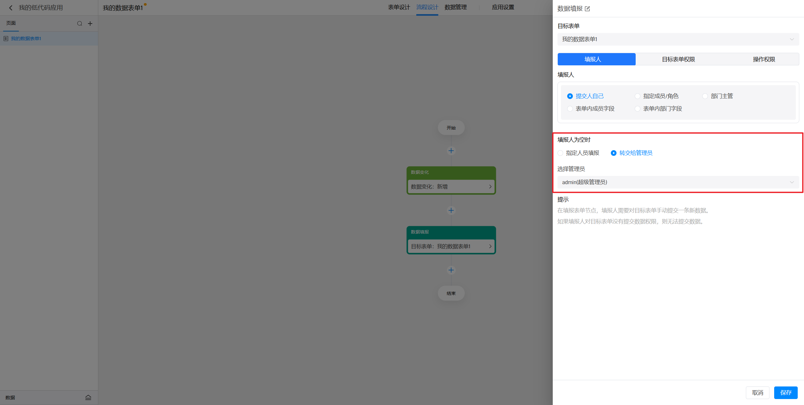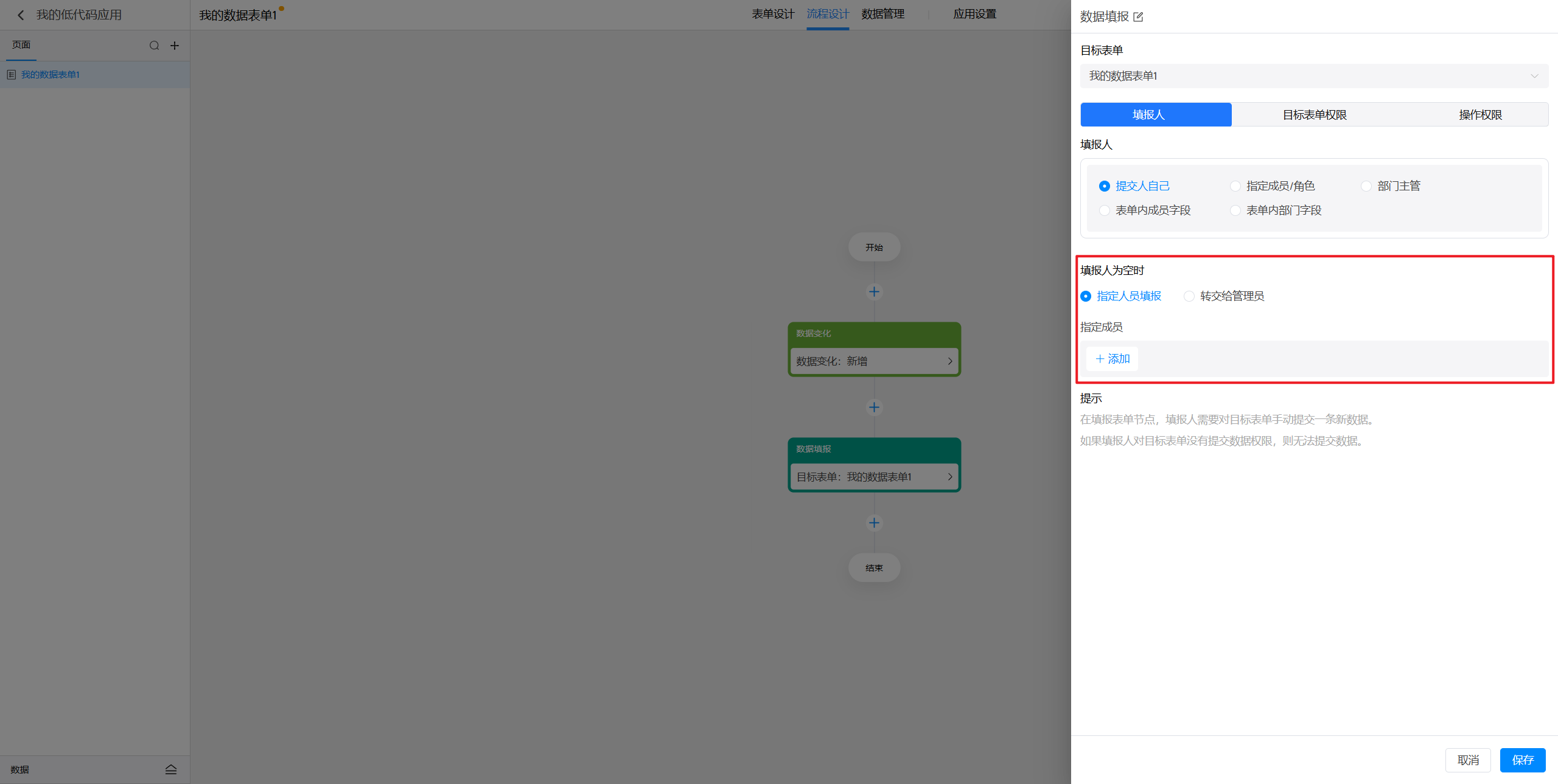 一般是通过设置填报人来进行人工填报,在填报条件完成前,流程会一直停留在数据填报节点上,不会往下执行,填报人需要反复提交新数据。