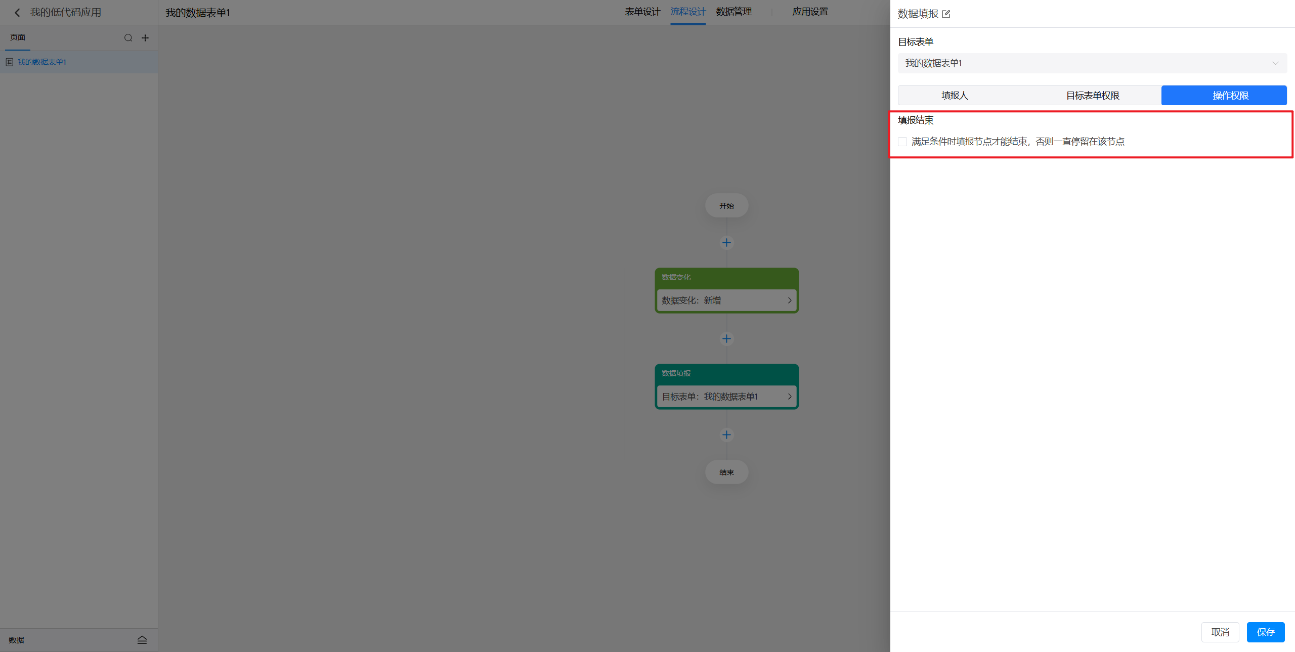 填报结束条件:在满足条件时填报节点才能结束,否则一直停留在该节点。
