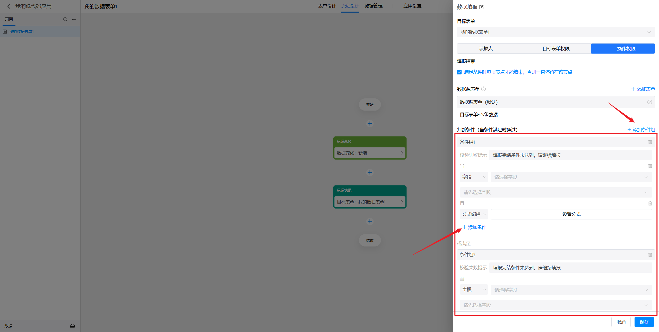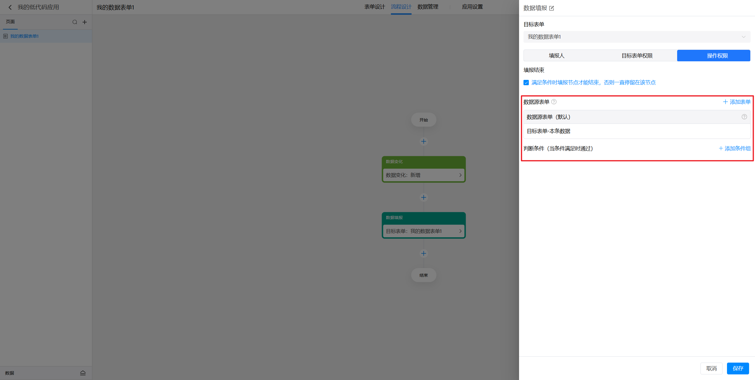 数据源表单主要是在判断条件中使用,默认包含本条数据,点击添加表单可以添加新的数据源表单。