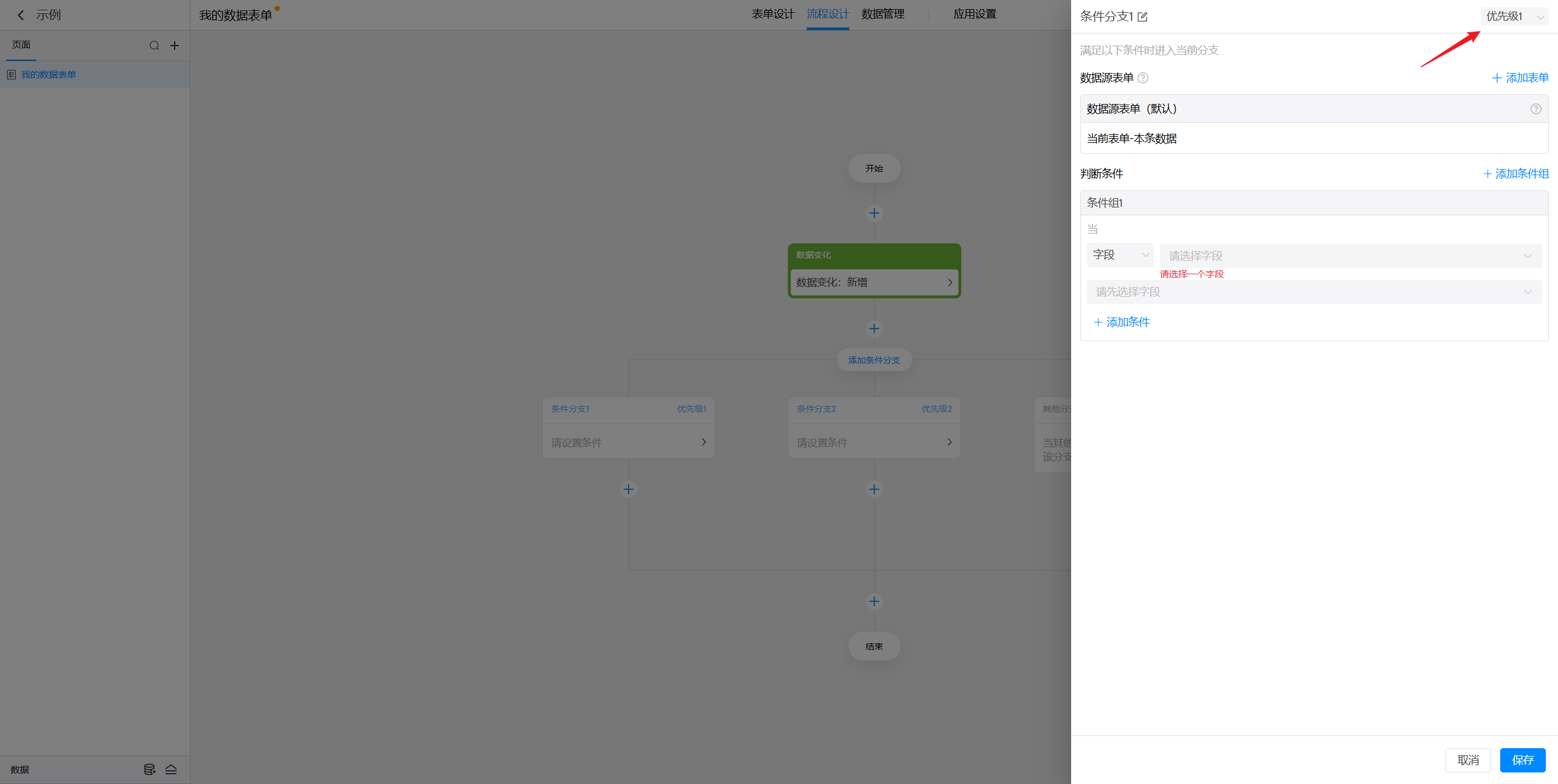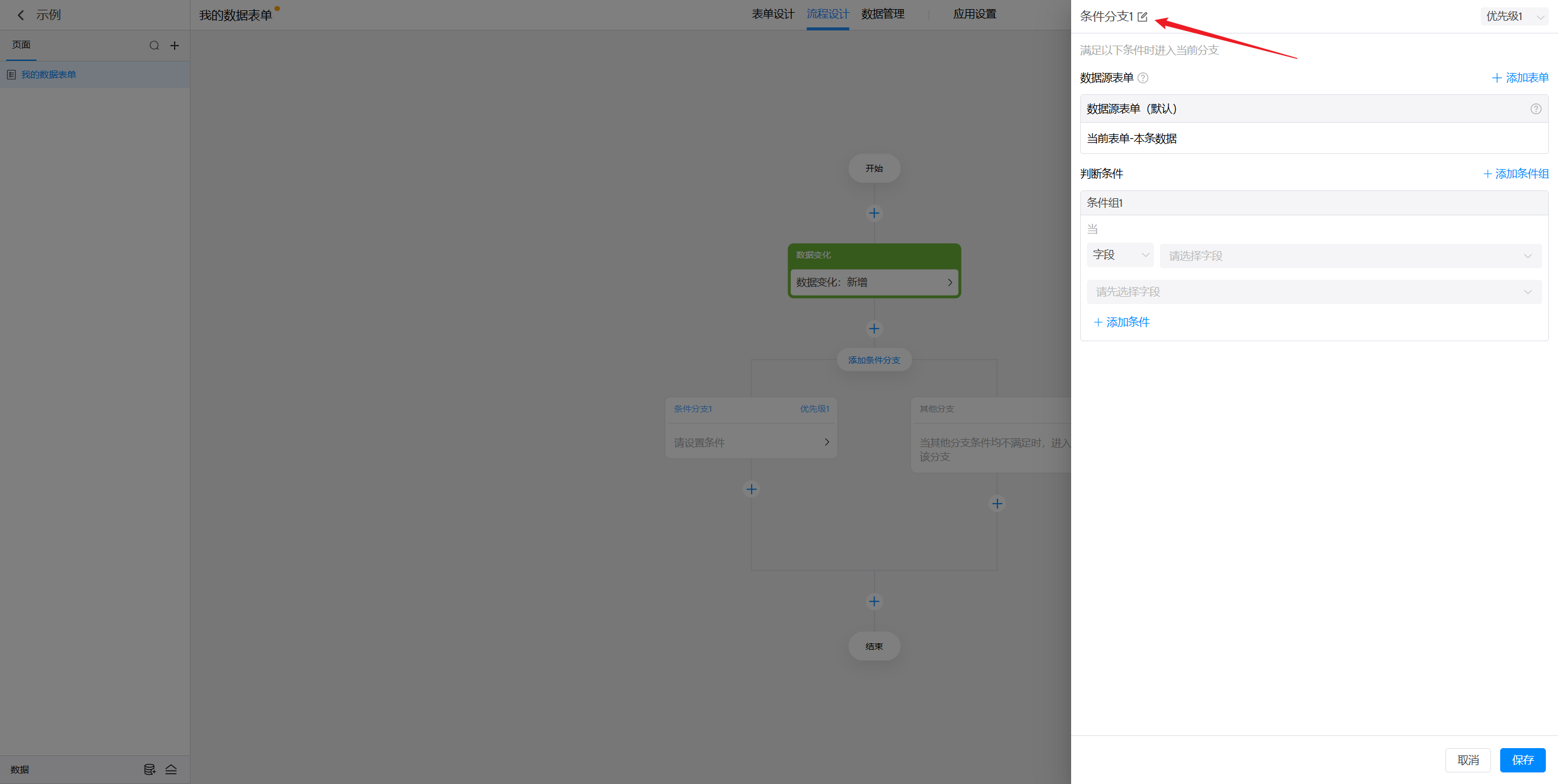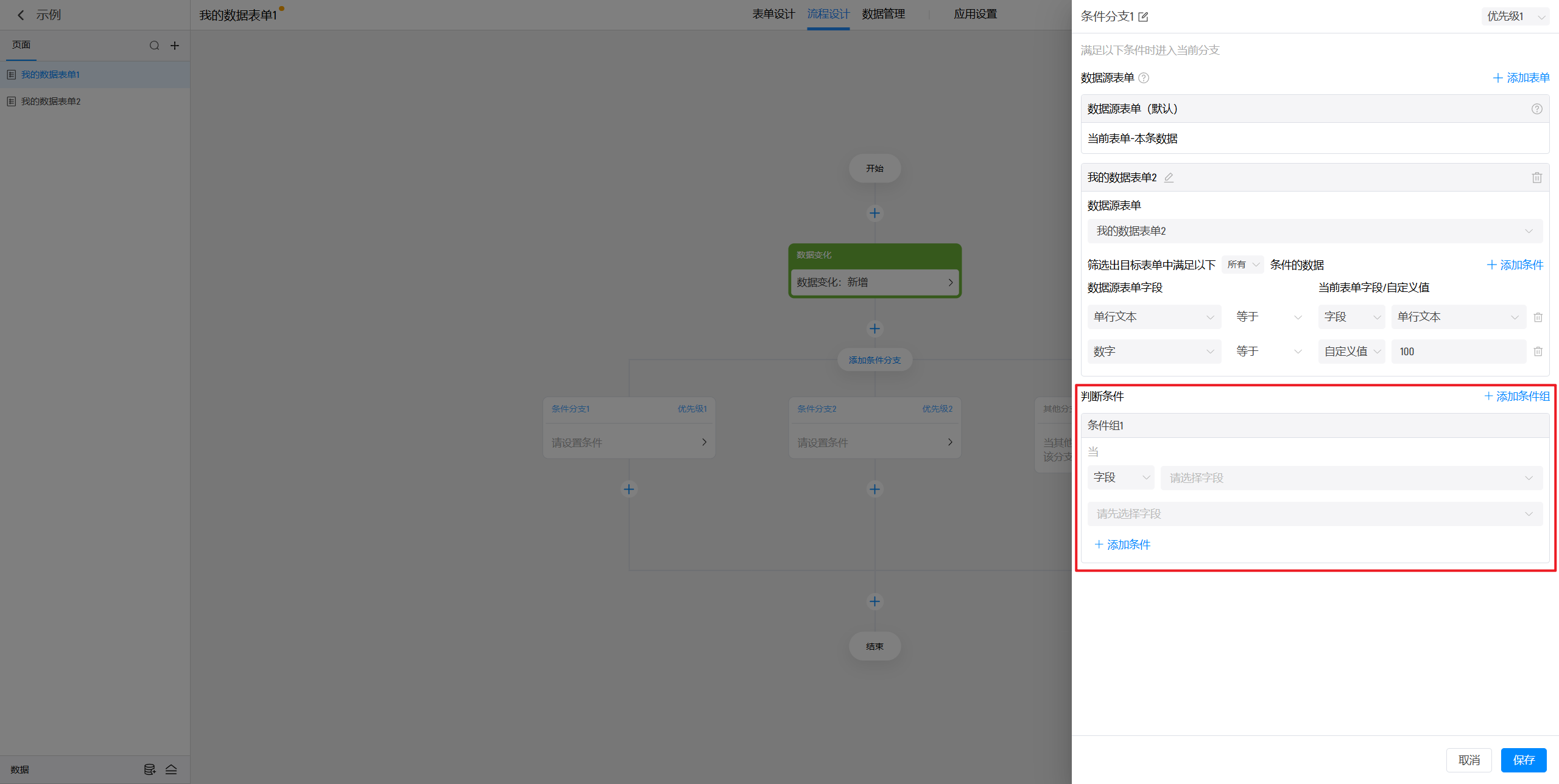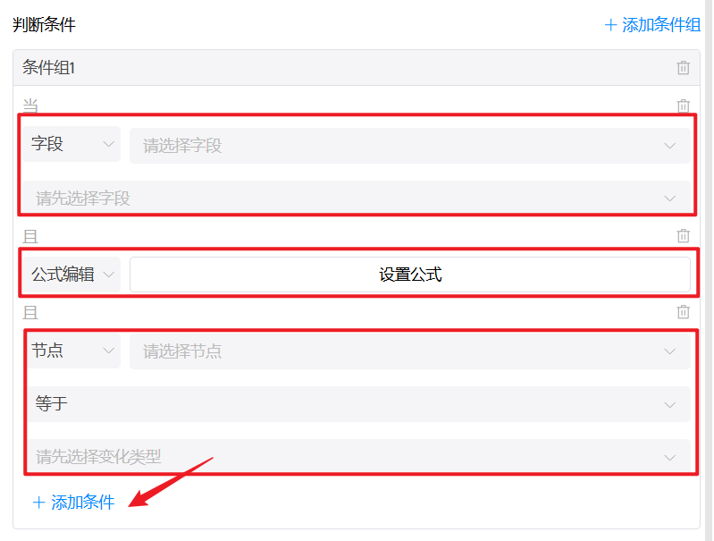 这里可以对字段(来自上面设置的数据源表单)进行直接判断,也可以通过编辑公式进行判断,或者基于触发节点(只适用于数据变化触发)的类型进行判断。