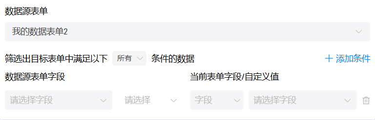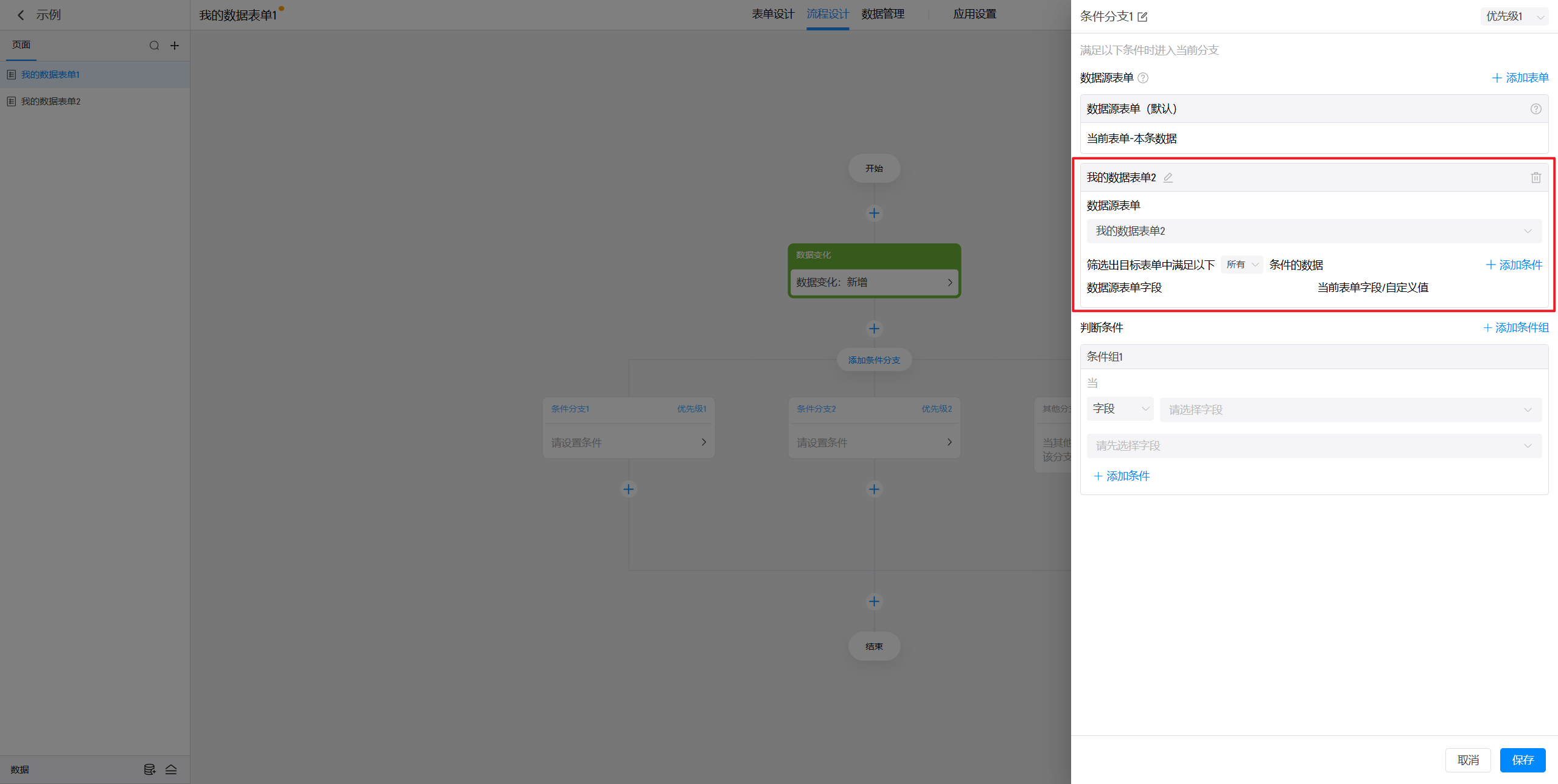 在设置分支的判断条件时,我们可能会用到一些数据作为判断条件,默认可以使用当前表单的本条数据(对于触发节点的新增/修改/删除某条数据),如果还需要使用其他的数据,就可以在这里进行添加。