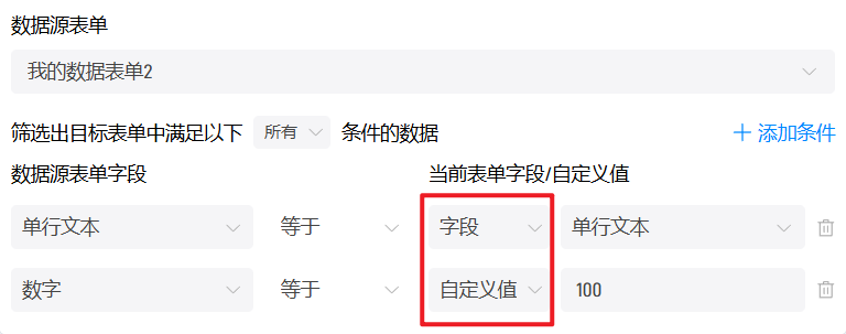 这里可以将数据源表单字段与当前表单字段相比较,也可以将数据源表单字段与自定值相比较,判断条件包括:等于/不等于/等于任意一个/不等于任意一个/包含/不包含/为空/不为空,具体和选择的数据源表单字段有关。