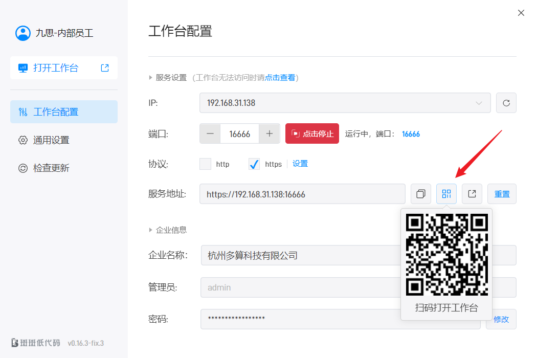 在 PC 客户端中,点击二维码按钮可以查看工作台访问的二维码,扫码即可打开工作台