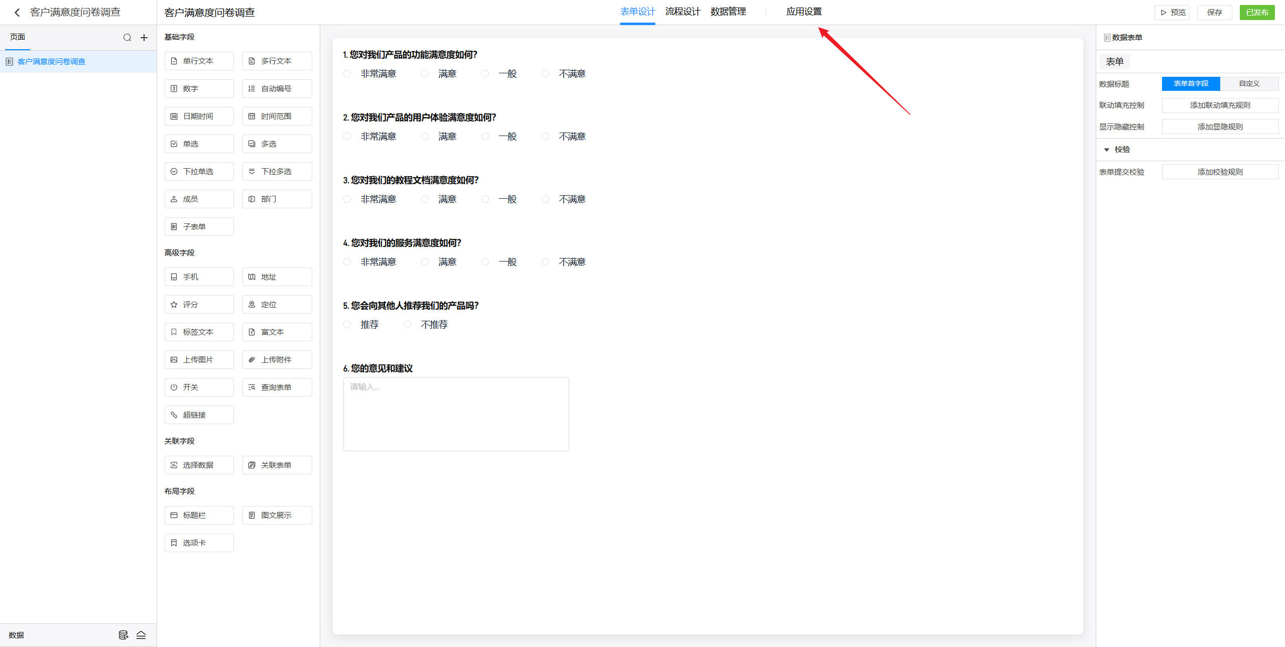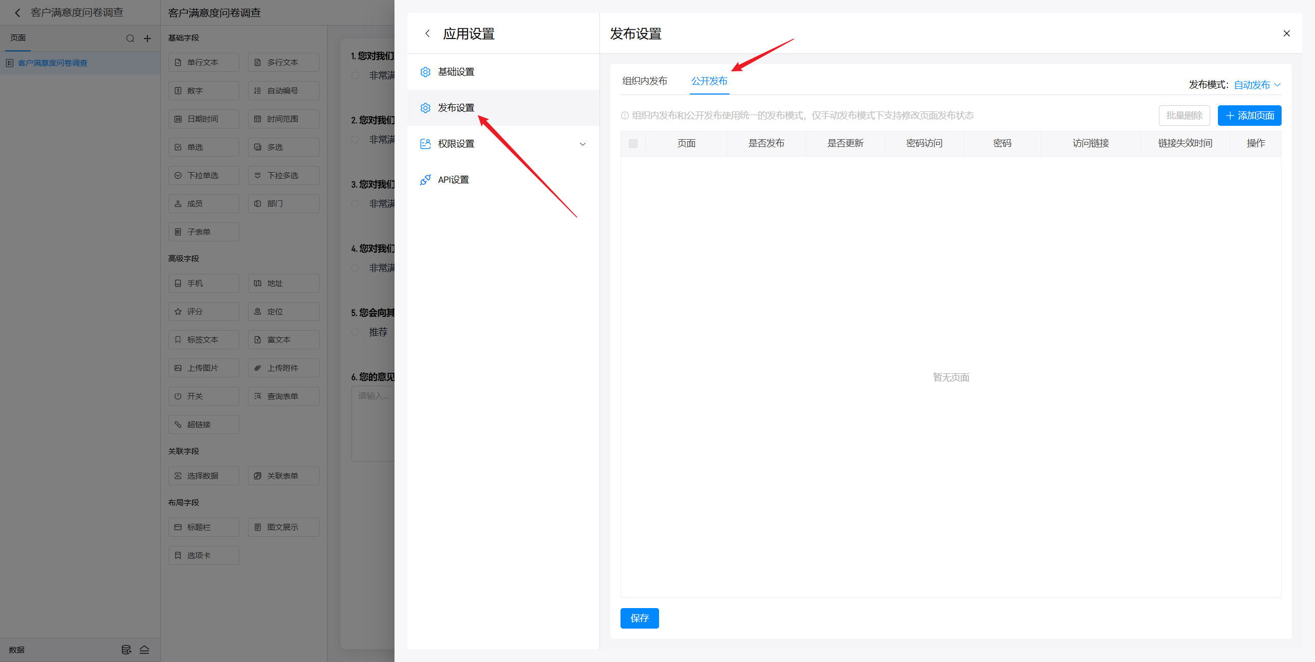在应用中点击设置,在发布设置中添加公开发布页面。