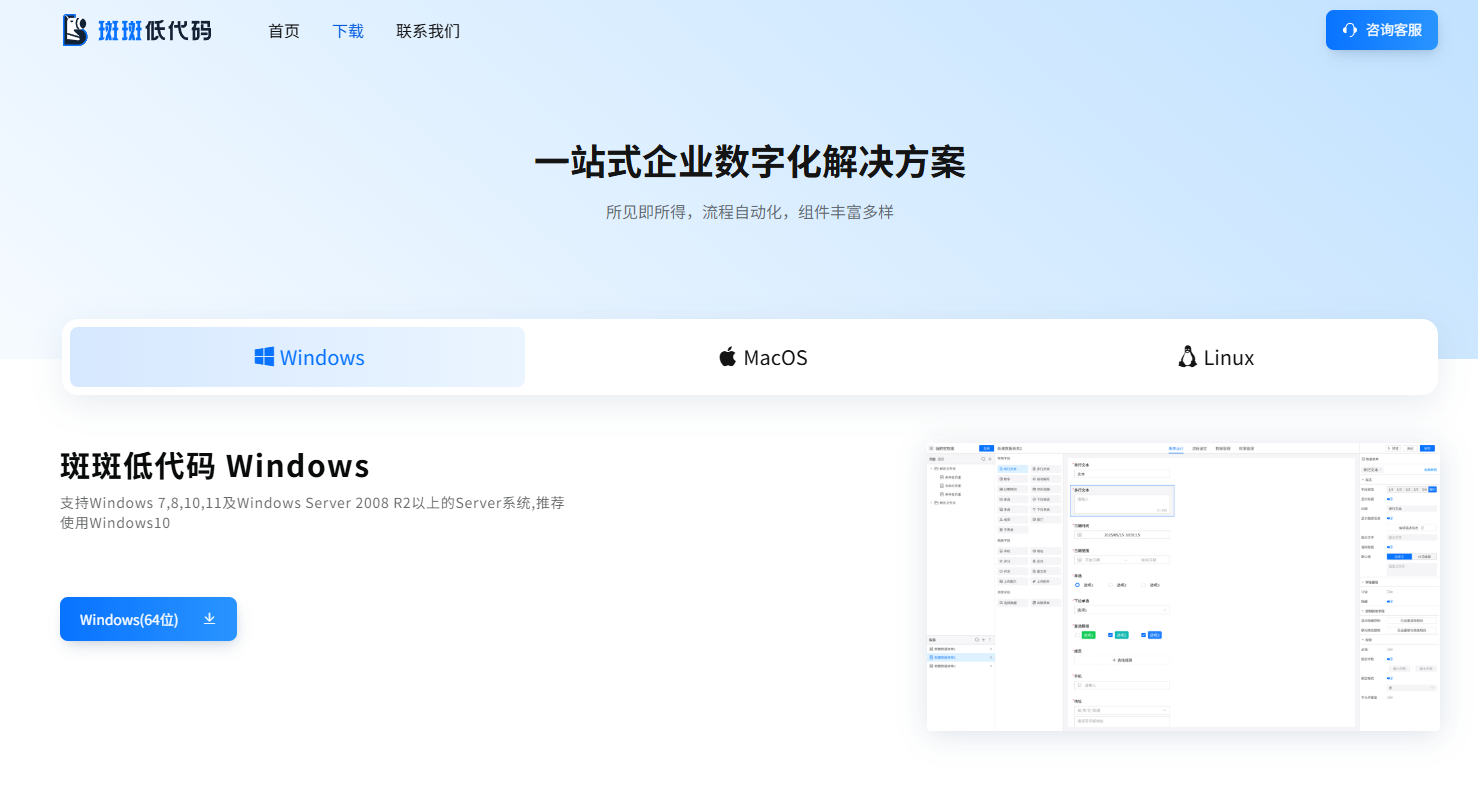 斑斑是一款本地私有化部署的低代码平台,所以你需要先下载一个客户端安装包。