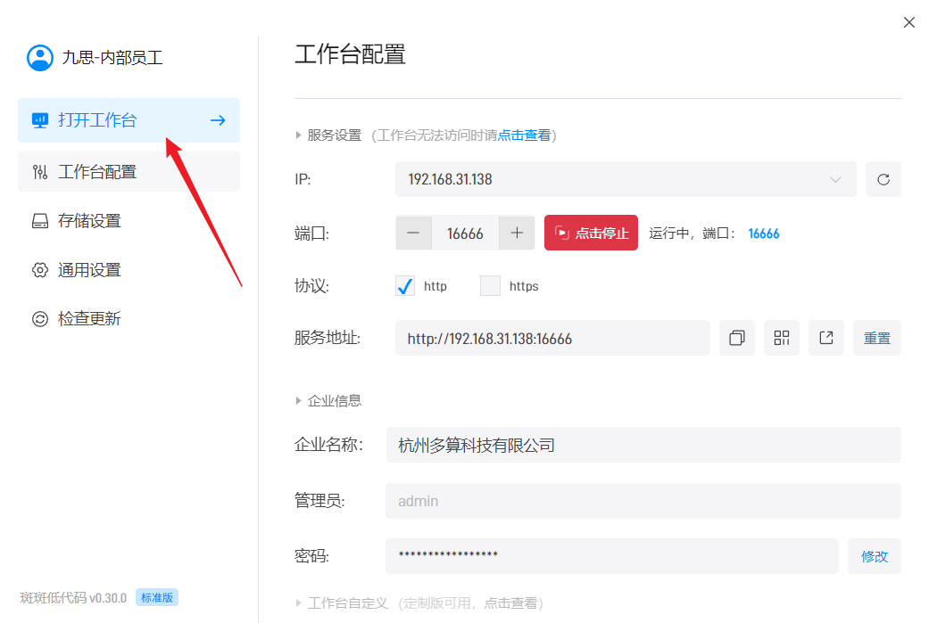 完成上述两步配置后,我们就可以在软件中点击打开工作台进行应用创建了。