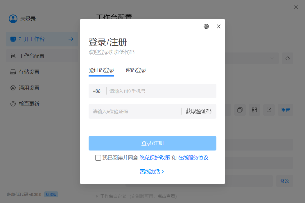 第一步,我们需要注册一个斑斑低代码的账号,这里我们通过手机验证码直接注册。