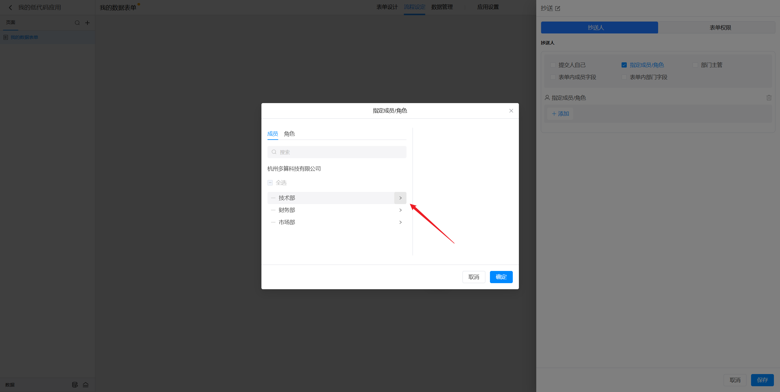需要注意的是,这里只能选择成员,所以需要点击部门右侧的按钮进入部门内部才能选择部门内的成员。