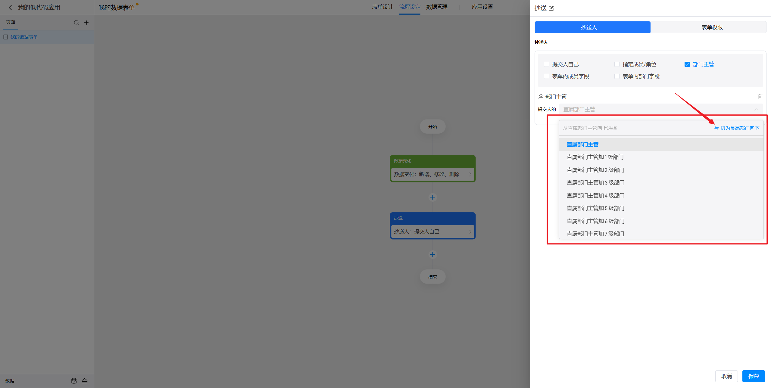 (5)表单内部门字段:指的是在当前表单中添加的某个部门字段所选择的部门的主管进行办理