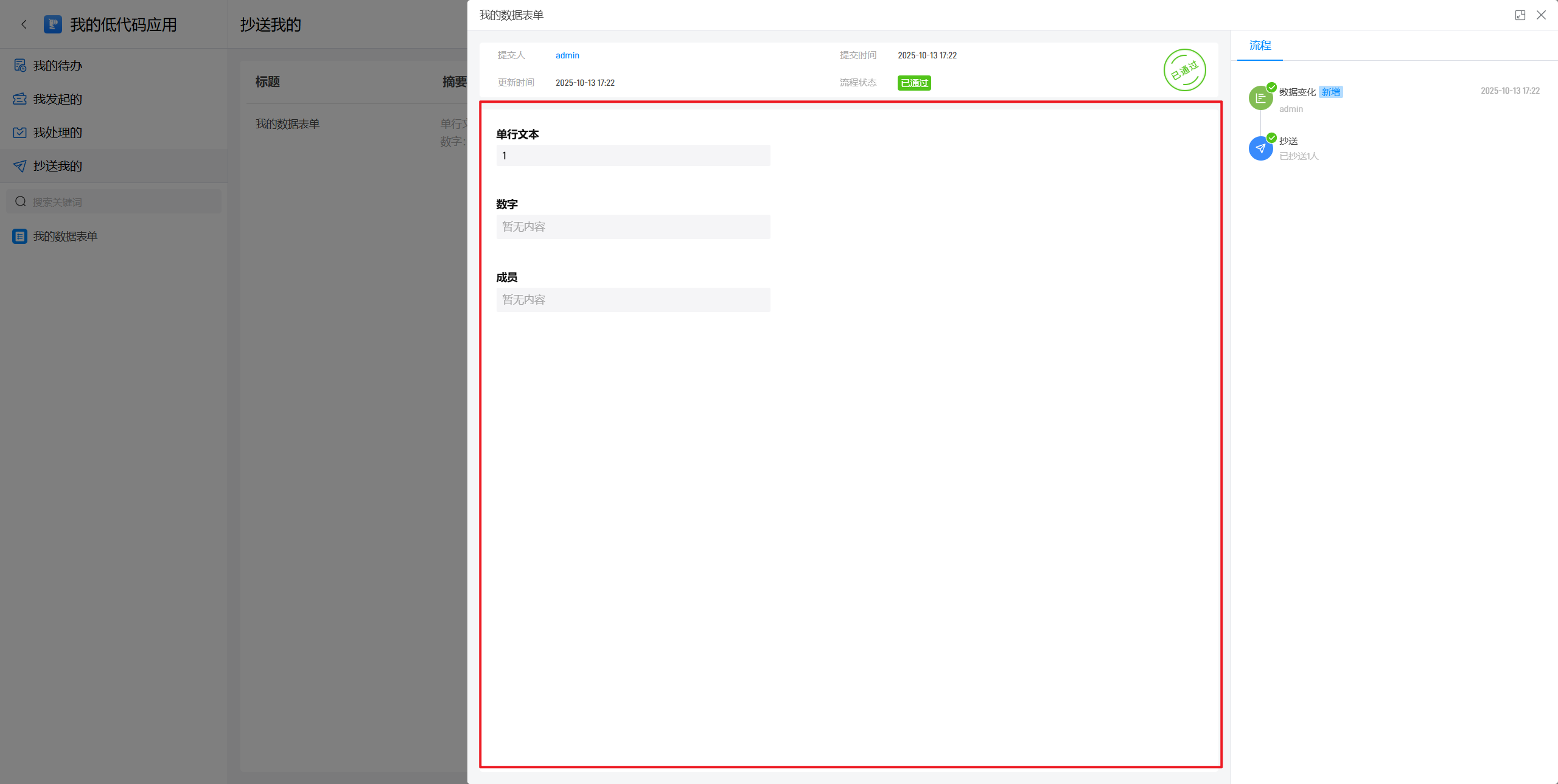抄送节点主要用来进行流程的通知,接收通知的成员可以在工作台中看到这条待办的信息。