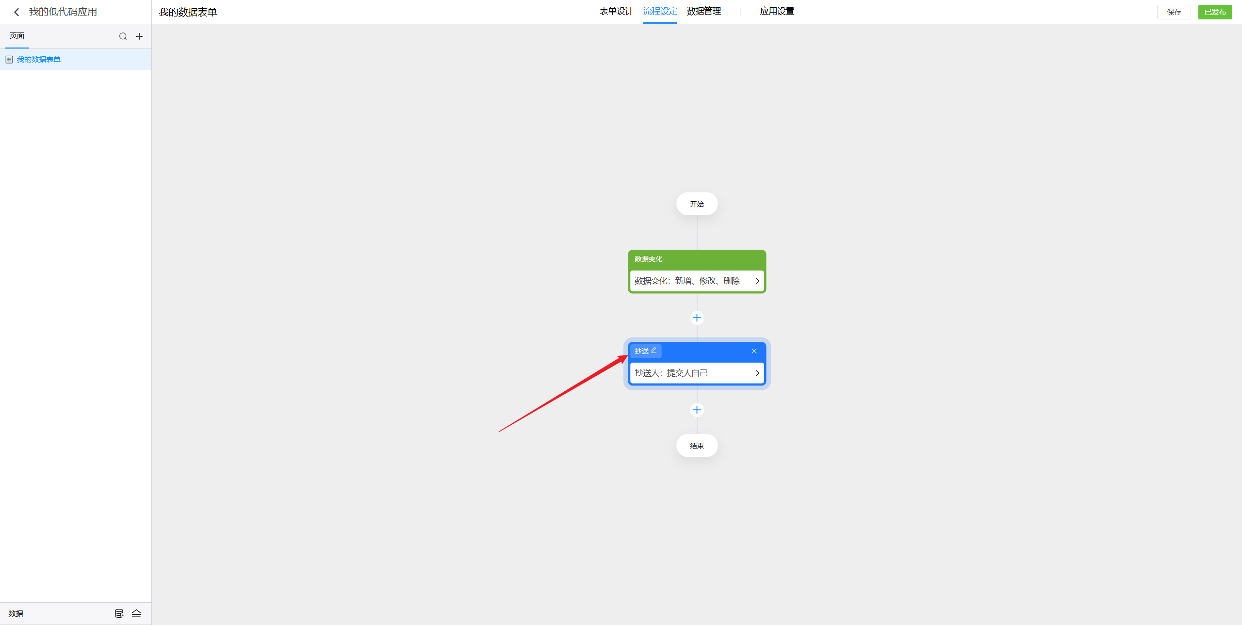 在添加触发节点后,就可以在流程中的任意位置添加抄送节点。