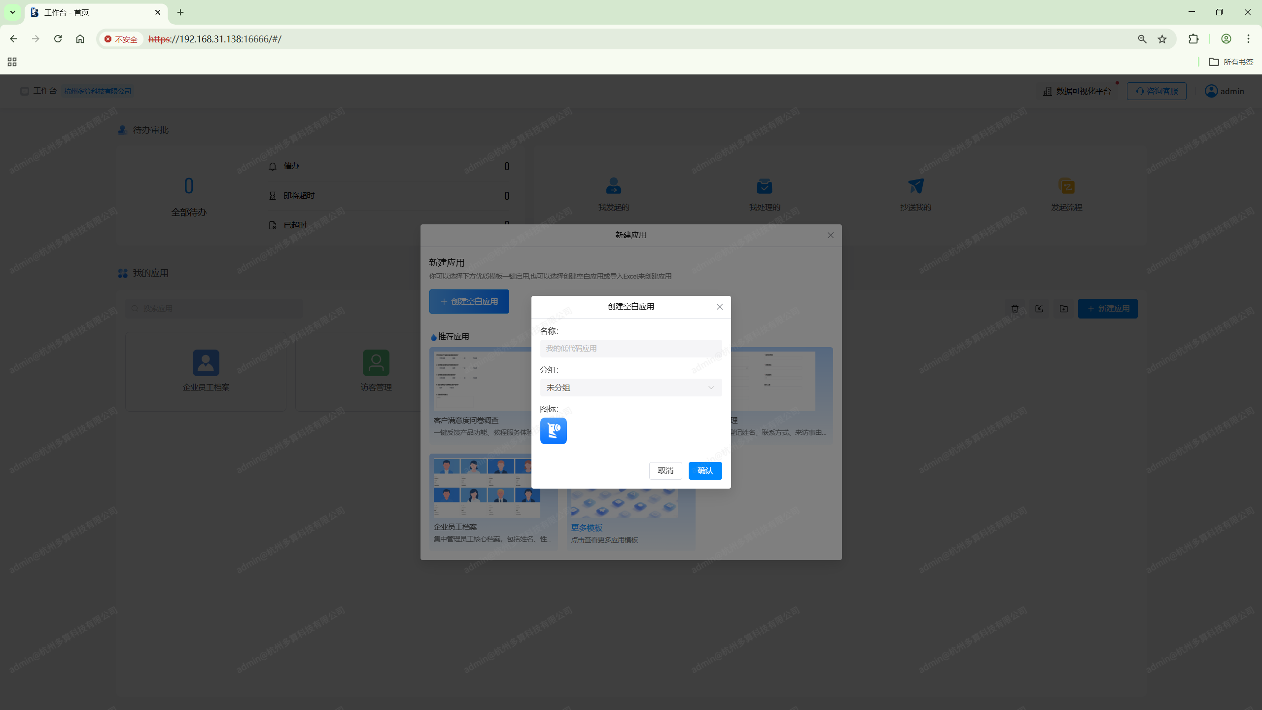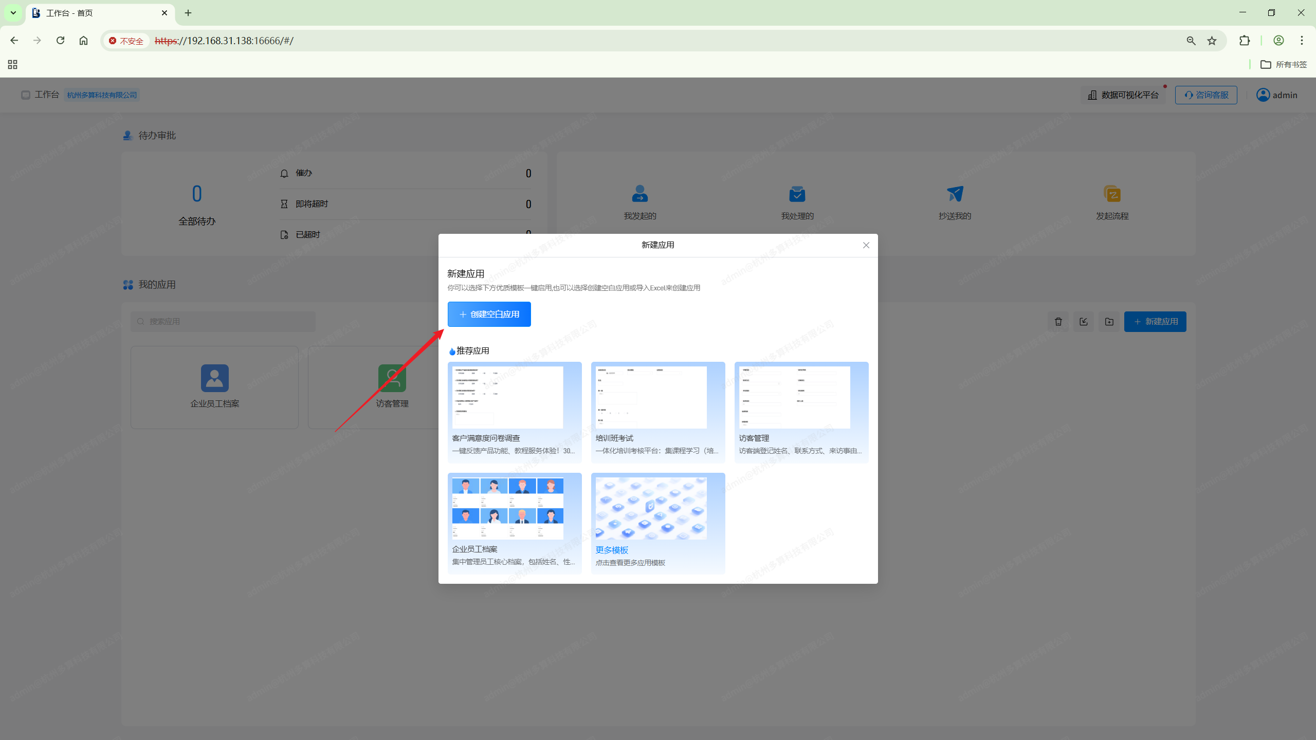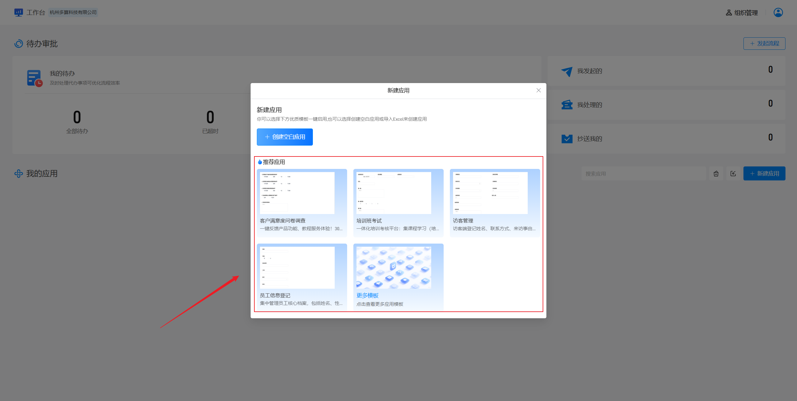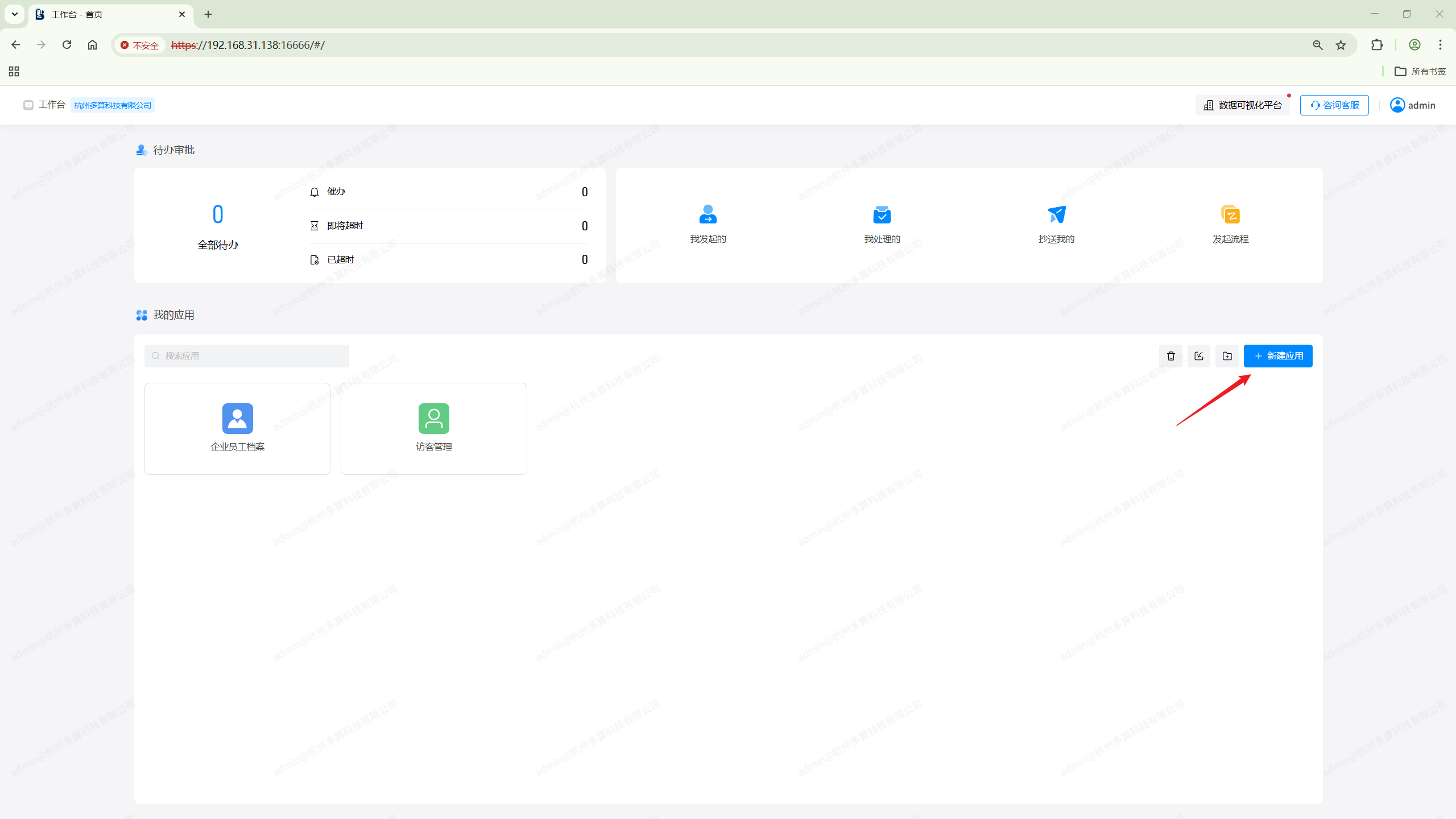 在工作台首页,**管理员账号**可以点击“新建应用”来创建新应用。